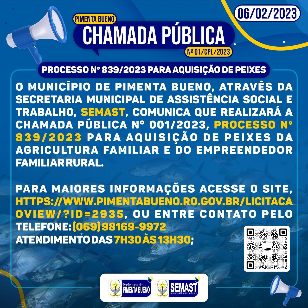 O Município de Pimenta Bueno, através da Secretaria Municipal de Assistência Social e Trabalho, SEMAST, comunica que realizará a Chamada Pública n° 001/2023, Processo Nº 839/2023 para Aquisição de Peixes da Agricultura Familiar e do Empreendedor Familiar Rural.
