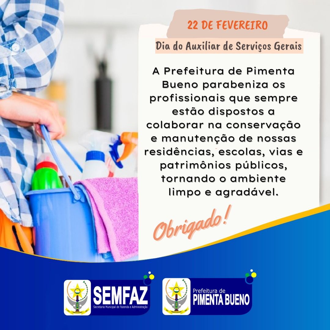 A Prefeitura de Pimenta Bueno parabeniza os profissionais que sempre estão dispostos a colaborar na conservação e manutenção de nossas residências, escolas, vias e patrimônios públicos, tornando o ambiente limpo e agradável.