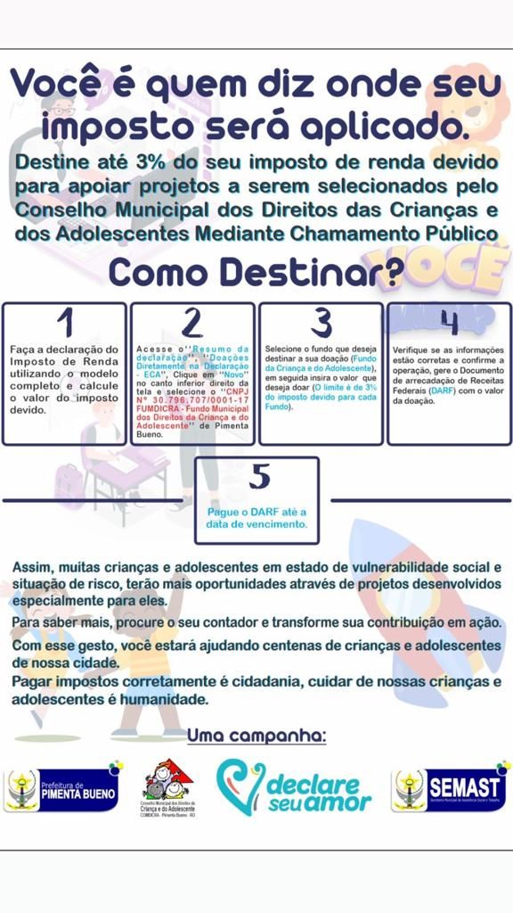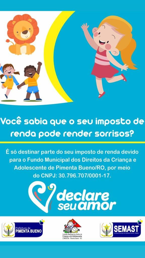 Contamos com a participação de toda população pimenta-buenense, para a destinação de até 3% do imposto devido, para o Fundo Municipal dos Direitos da Criança e do Adolescente – FUMDICRA de Pimenta Bueno.