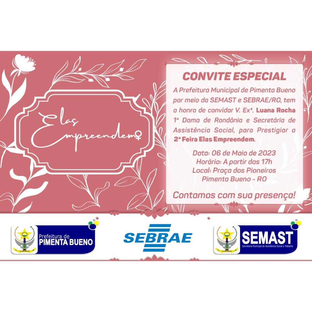 A Prefeitura de Pimenta Bueno, por meio da SEMAST em parceria com o SEBRAE/RO, realizará no dia 06 de maio a 2ª Feira Elas Empreendem