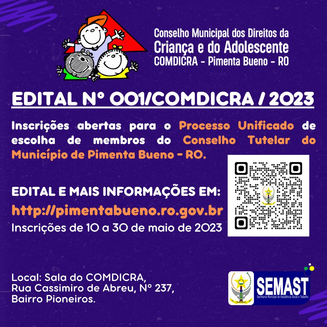 O Conselho Municipal dos Direitos da Criança e do Adolescente de Pimenta Bueno - RO, publica o Edital de Convocação para o Terceiro Processo de Escolha Unificada para membros do Conselho Tutelar para o quadriênio 2024/2027.