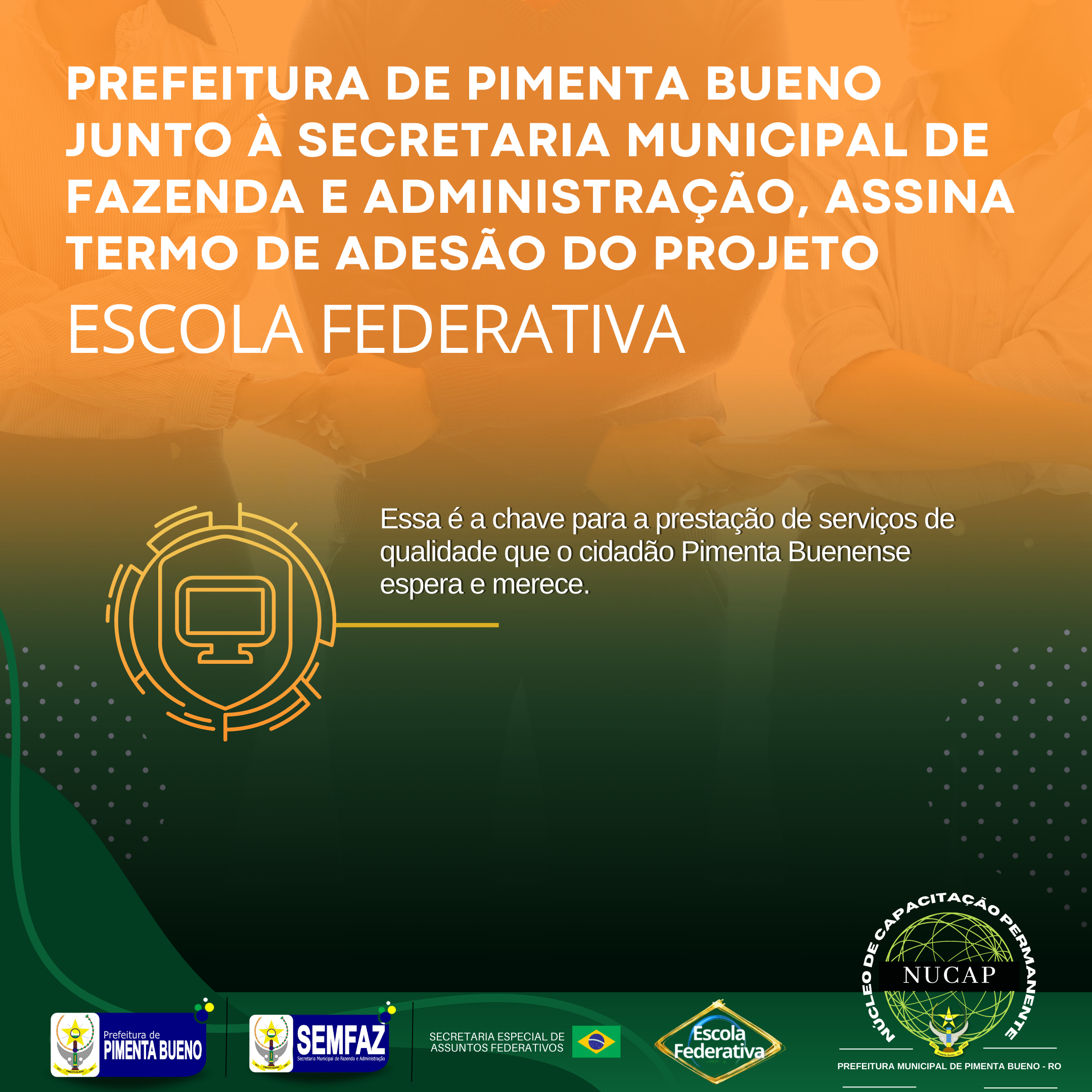 Com o objetivo de nivelar o conhecimento e a educação continuada dos servidores públicos em relação às principais atividades do município, a Prefeitura Municipal de Pimenta Bueno junto à Secretaria Municipal de Fazenda e Administração, firmaram Termo de Adesão com a Escola Federativa do Governo Federal para oferecer cursos via EAD aos servidores públicos municipais.