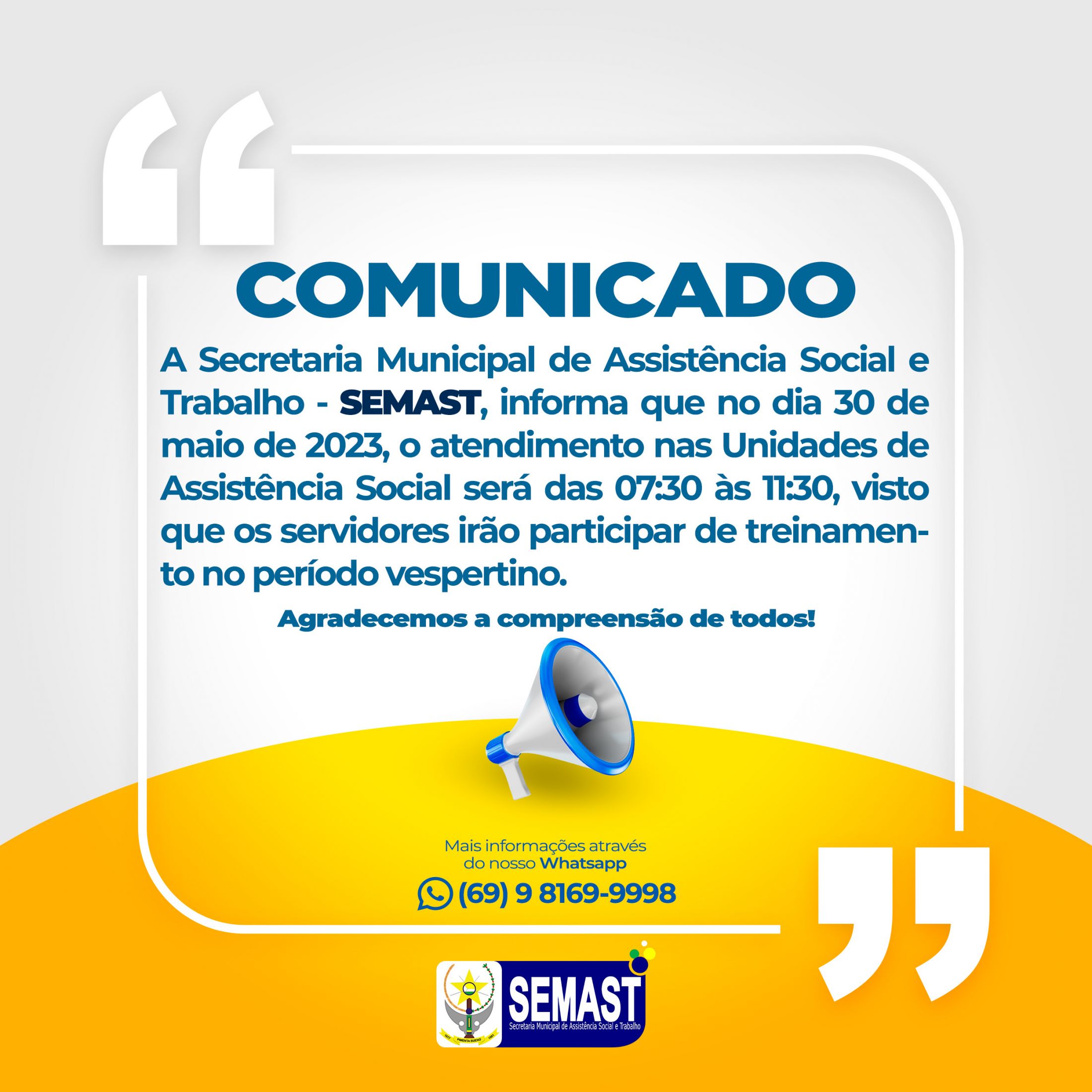 A Secretaria Municipal de Assistência Social e Trabalho - SEMAST, informa que no dia 30 de maio de 2023, o atendimento nas Unidades de Assistência Social será das 07:30 às 11:30, visto que os servidores irão participar de treinamento no período vespertino.