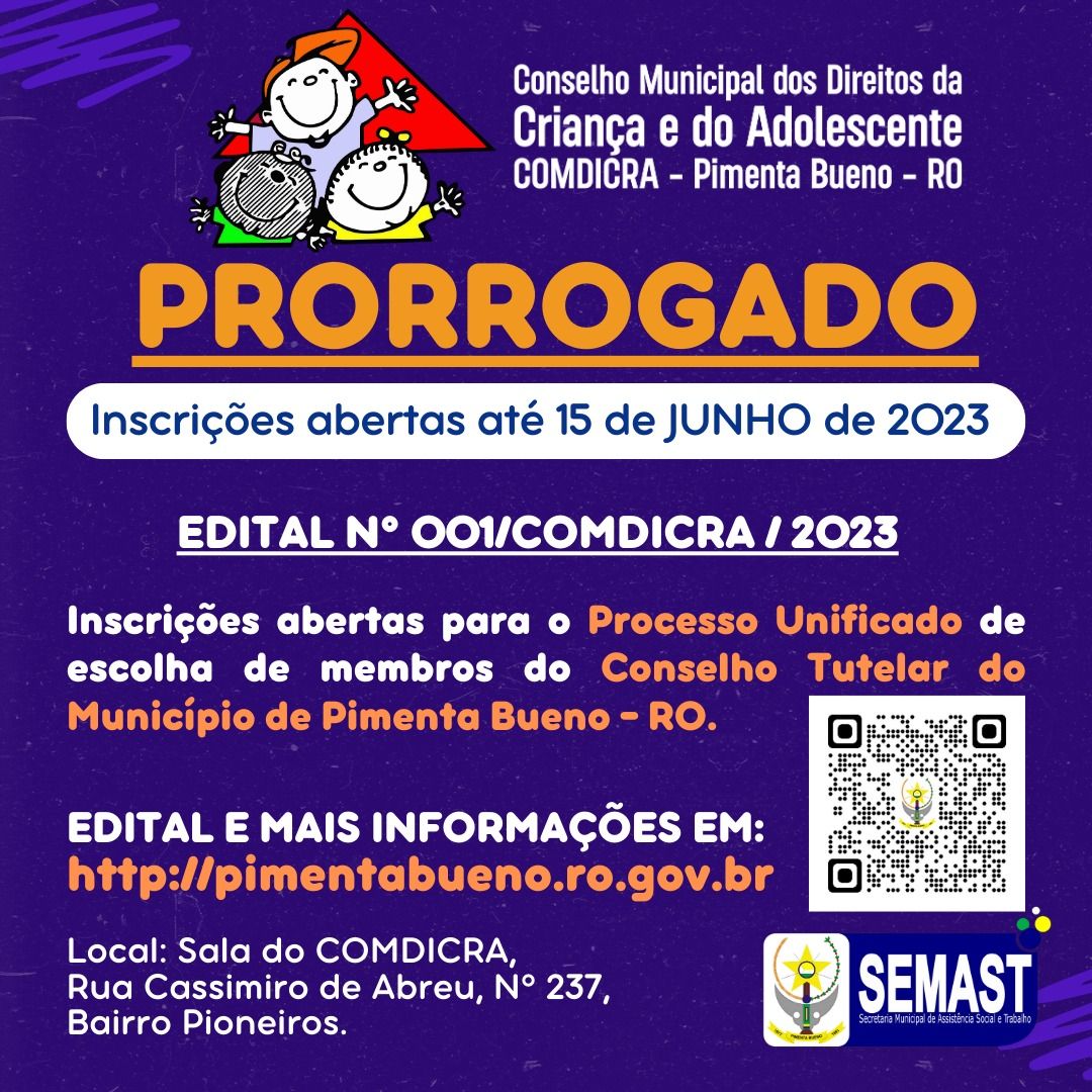 O Conselho Municipal dos Direitos da Criança e do Adolescente de Pimenta Bueno - RO, informa que está PRORROGADO O PRAZO DE INSCRIÇÕES, do Terceiro Processo de Escolha Unificada para Membros do Conselho Tutelar para o quadriênio 2024 - 2027, referente ao Edital n. 001/COMDICRA/2023, até o dia 15 de Junho de 2023.