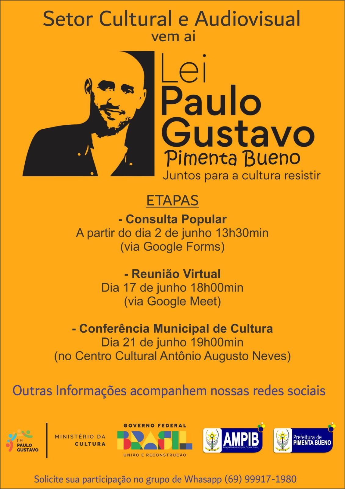 A Prefeitura de Pimenta Bueno, por meio da Autarquia Municipal de Esporte, Cultura e Turismo, abriu a consulta pública para recolher sugestões e demandas da sociedade que compõem a cadeia produtiva de arte e cultura. A proposta é reunir dados que possam nortear a elaboração do Plano de Ação para viabilizar a execução da Lei Complementar nº 195 de 8 de julho de 2022, conhecida como Lei Paulo Gustavo.