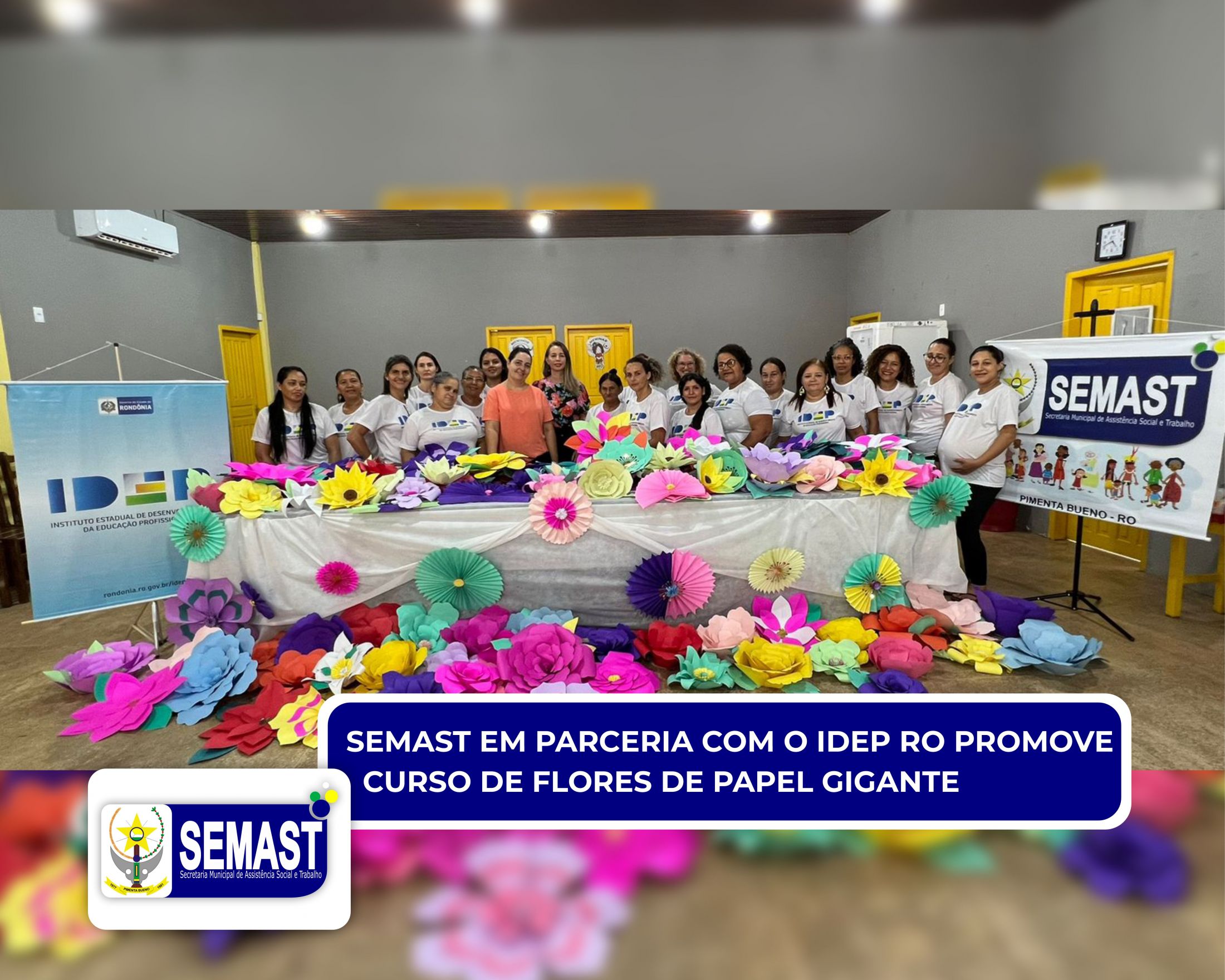 A Secretaria Municipal de Assistência Social e Trabalho - SEMAST, em parceria com o IDEP RO, promoveu o Curso de Flores de Papel Gigante, no período de 22 a 26 de maio/ 2023, no Centro Comunitário Pedro Cantelli, período Matutino, carga horária 20 horas, ministrado pela professora Fabiana Pozza de Jesus.