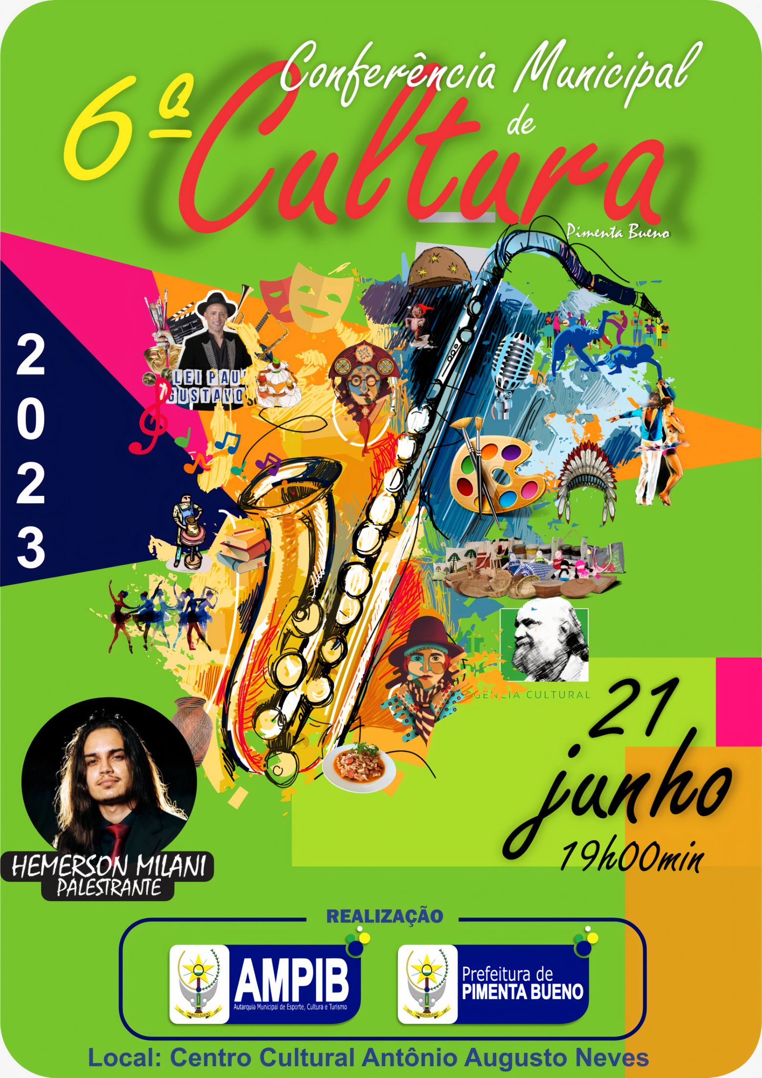 No dia 21 de junho, às 19h, no Centro Cultural Antônio Augusto Neves, convidamos você, que faz parte da área da cultura, a participar da Sexta Conferência Municipal de Cultura. Este evento tem como objetivo fortalecer a cultura de Pimenta Bueno, abordando diversos assuntos, como a Lei Paulo Gustavo, a Lei Aldir Blanc 1 e 2, o Conselho de Cultura e o Plano Municipal de Cultura. Contamos com a sua presença neste importante movimento em prol da cultura da nossa cidade.