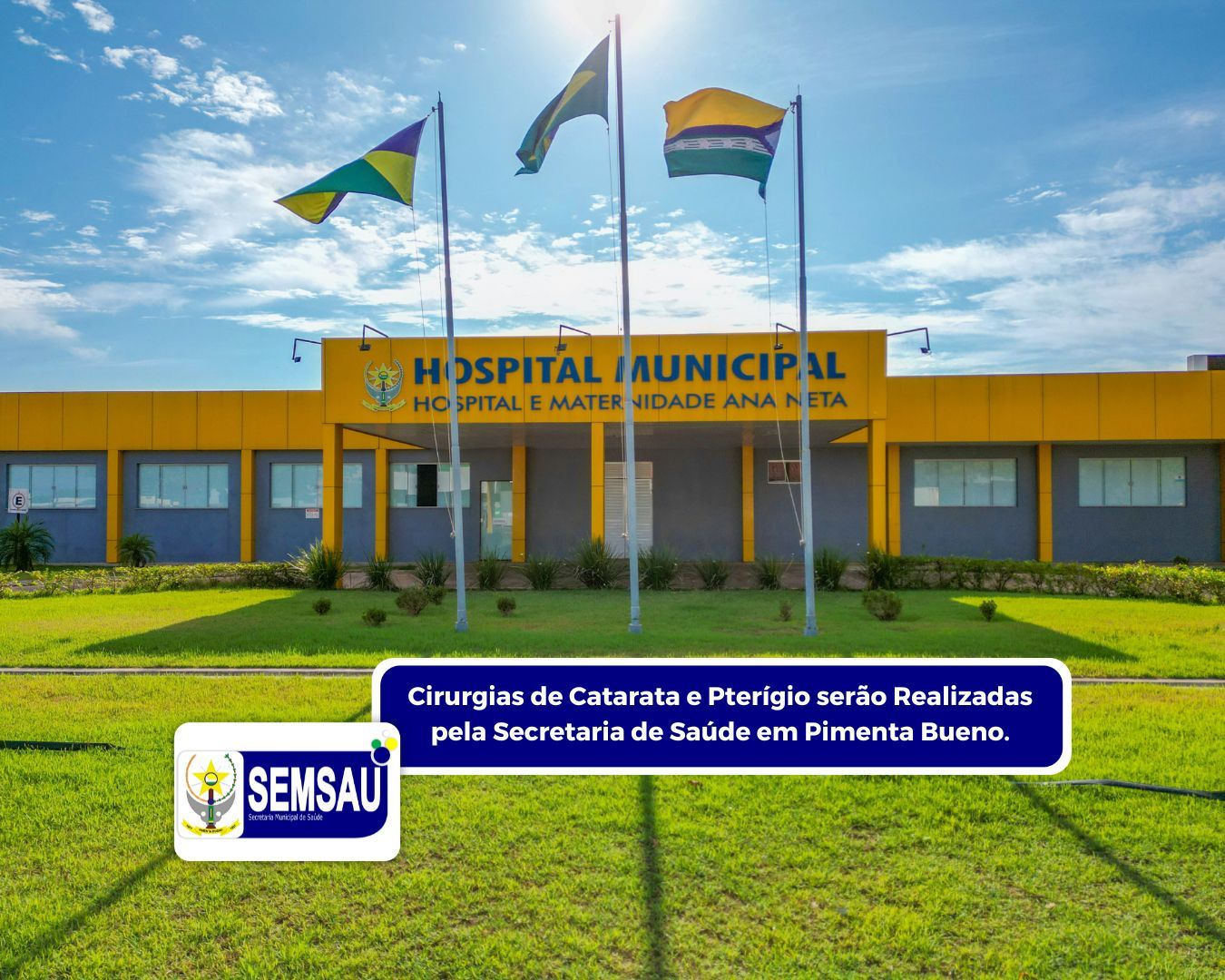 A Prefeitura de Pimenta Bueno, por meio da Secretaria Municipal de Saúde, tem o prazer de anunciar que em breve serão realizadas cirurgias eletivas de catarata e pterígio no Hospital Municipal Ana Neta.