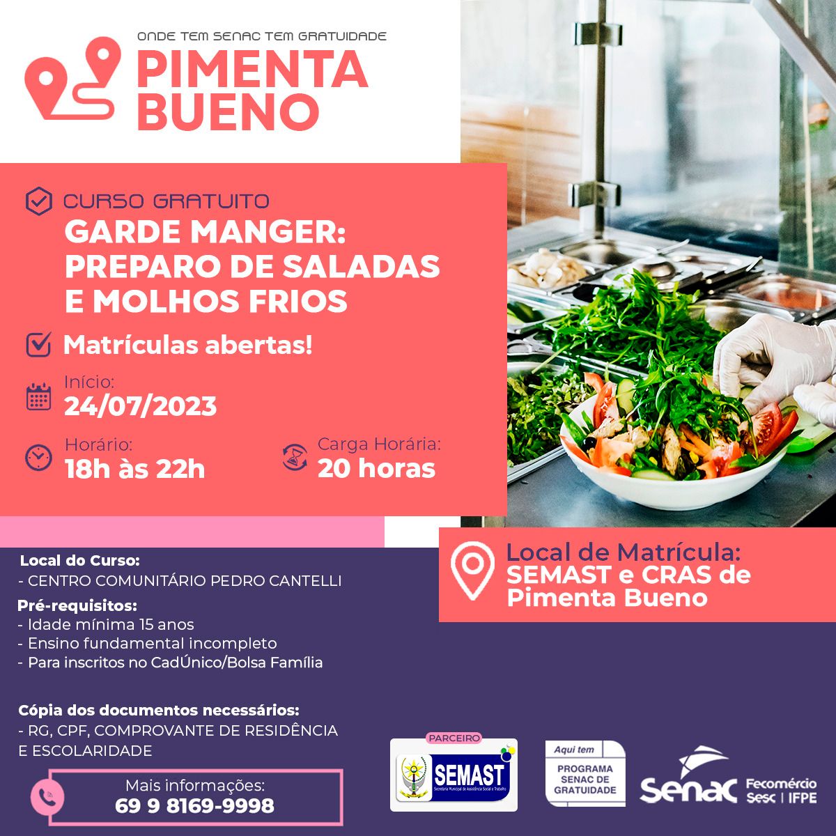 A Secretaria Municipal de Assistência Social e Trabalho – SEMAST, em parceria com o Senac Pimenta Bueno promove curso GRATUITO de PREPARO DE SALADAS E MOLHOS FRIOS: