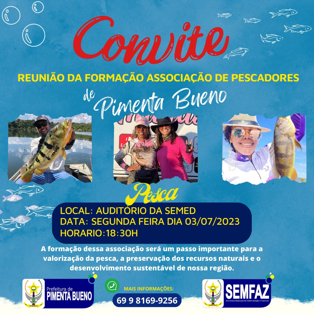 A Prefeitura de Pimenta Bueno, juntamente com a Secretaria Municipal de Administração e Fazenda, tem a satisfação de convidar todos os pescadores e interessados na valorização da pesca, preservação de recursos naturais e desenvolvimento sustentável da região para uma importante reunião. O encontro tem como objetivo a formação da Associação de Pescadores de Pimenta Bueno, uma iniciativa que busca unir esforços e promover ações conjuntas em prol da pesca responsável e do fortalecimento da atividade pesqueira em nosso município.