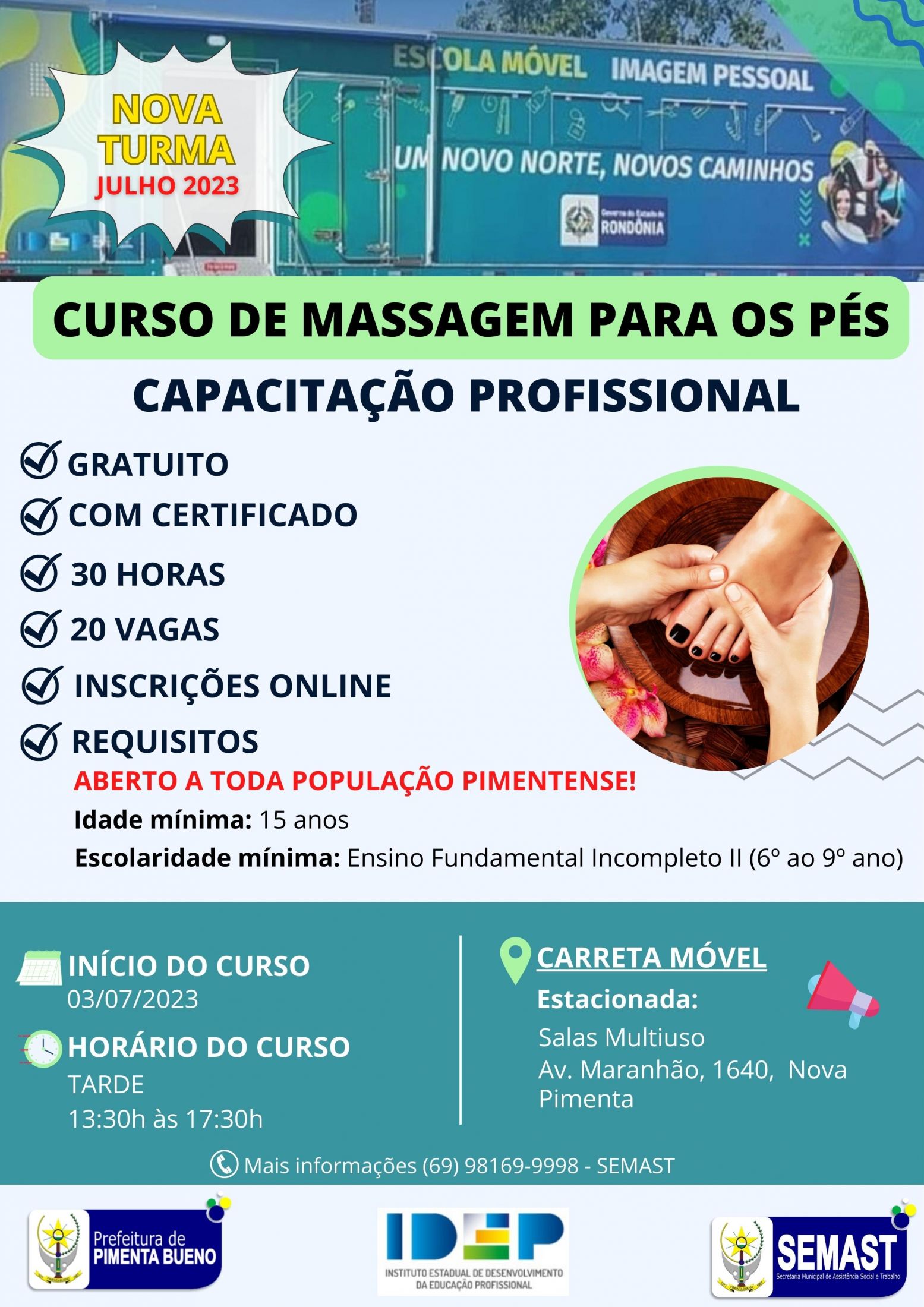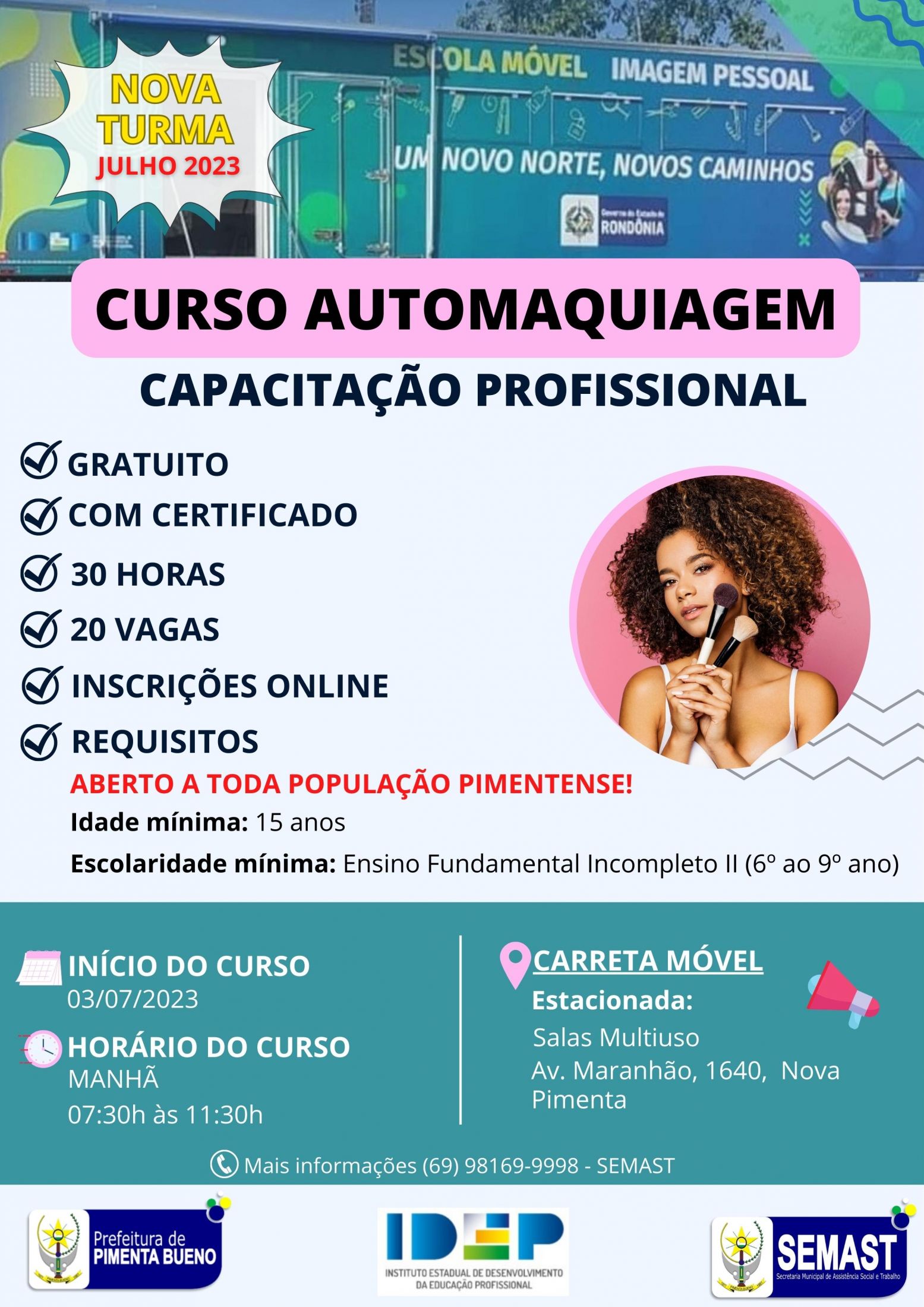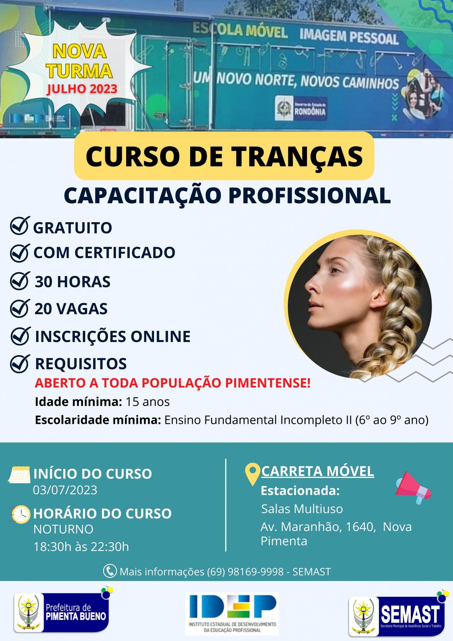 A Prefeitura Municipal de Pimenta Bueno em parceria com o IDEP/Governo do Estado de Rondônia, por meio da SEMAST, informa o cronograma das NOVAS TURMAS dos cursos que serão realizados no mês de JULHO de 2023, na Escola Móvel de Imagem Pessoal.