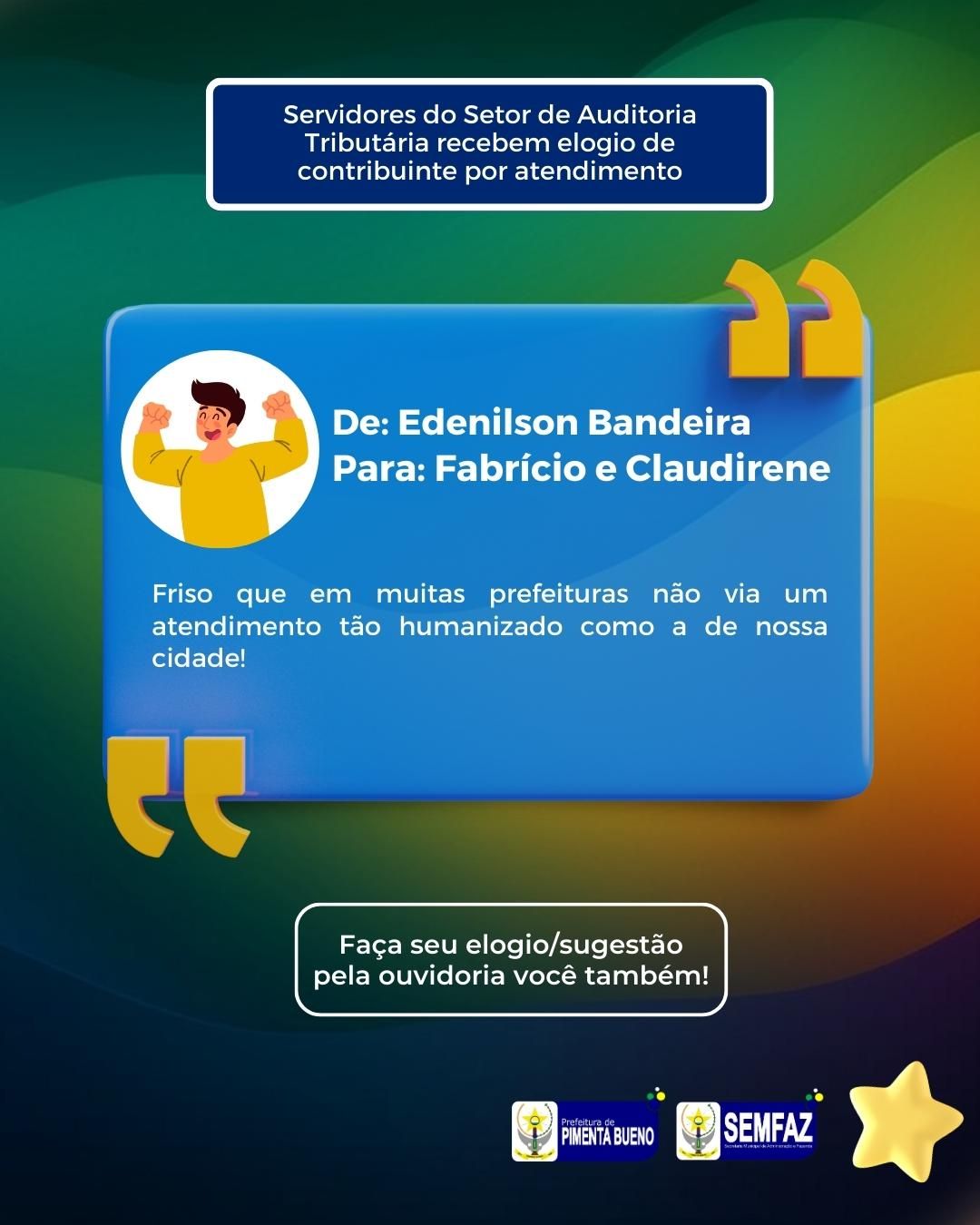 Os servidores Fabrício e Claudirene, do Setor de Auditoria Tributária, foram elogiados por seu excelente atendimento. O contribuinte Edenilson Bandeira, da Empresa Elite Alarmes, expressou sua gratidão e parabenizou a dupla pelo tratamento humano e acolhedor que recebeu.