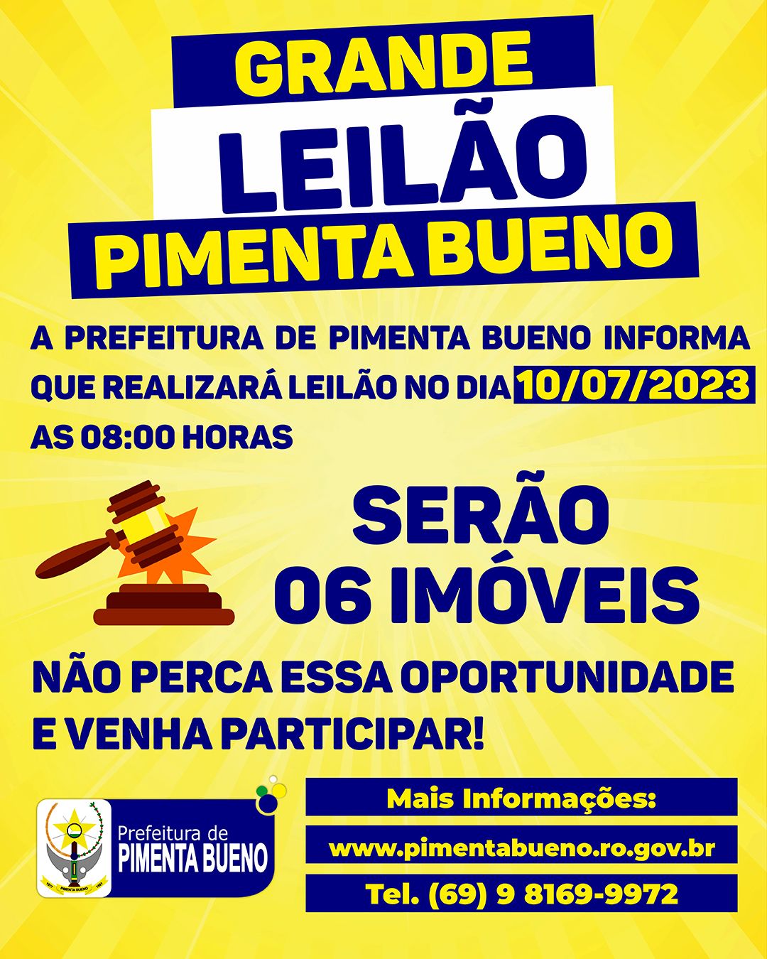 A Prefeitura Municipal de Pimenta Bueno informa à toda a população que acontecerá Leilão de imóveis vazios e construídos na data de 10/07/2023. Não perca esta oportunidade de adquirir o seu imóvel.