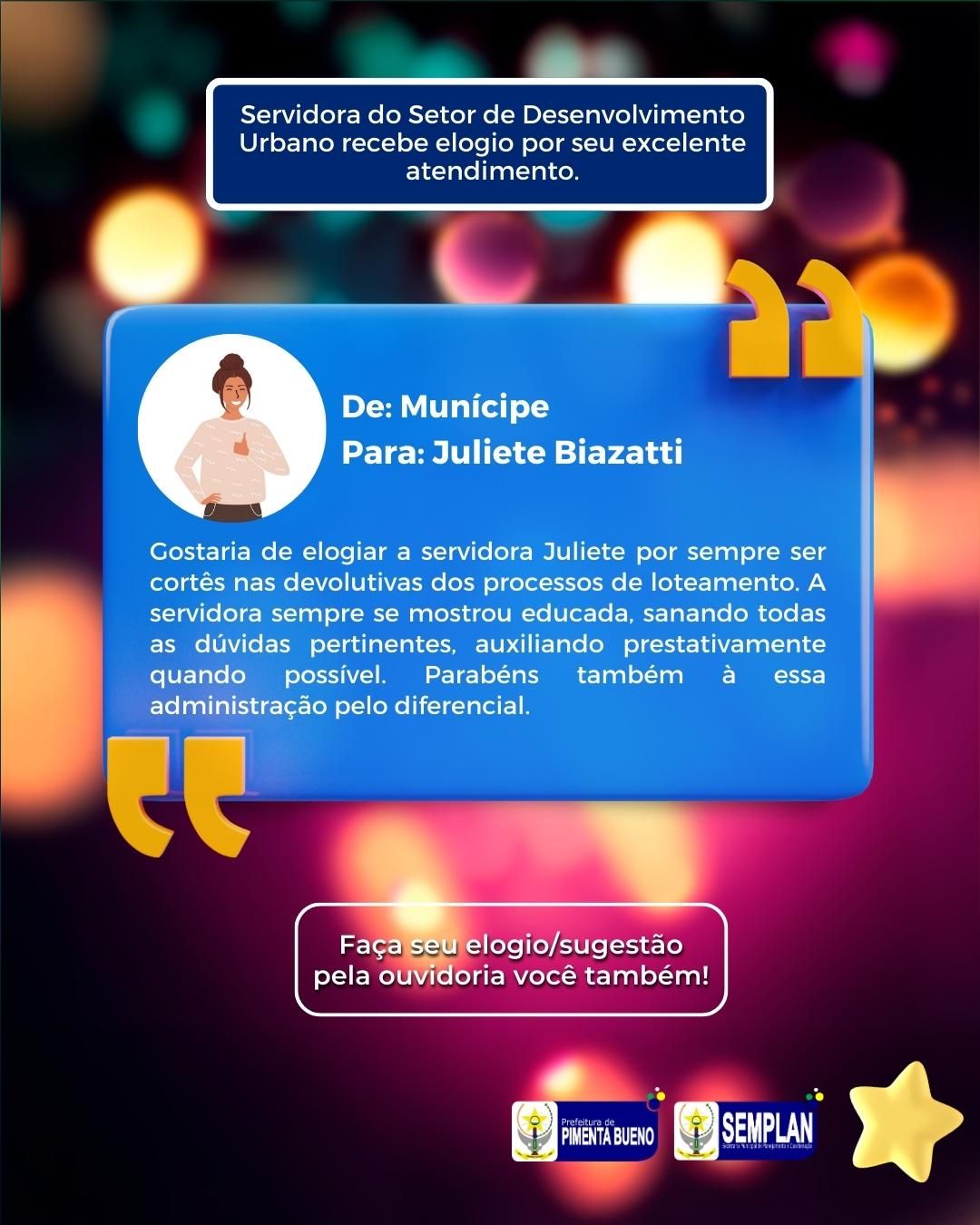 A Prefeitura de Pimenta Bueno se orgulha em compartilhar mais um exemplo de excelência no atendimento ao cidadão. Juliete Biazatti, servidora do Setor de Desenvolvimento Urbano, recebeu elogio de contribuinte, que gentilmente preferiu não ter seu nome divulgado.
