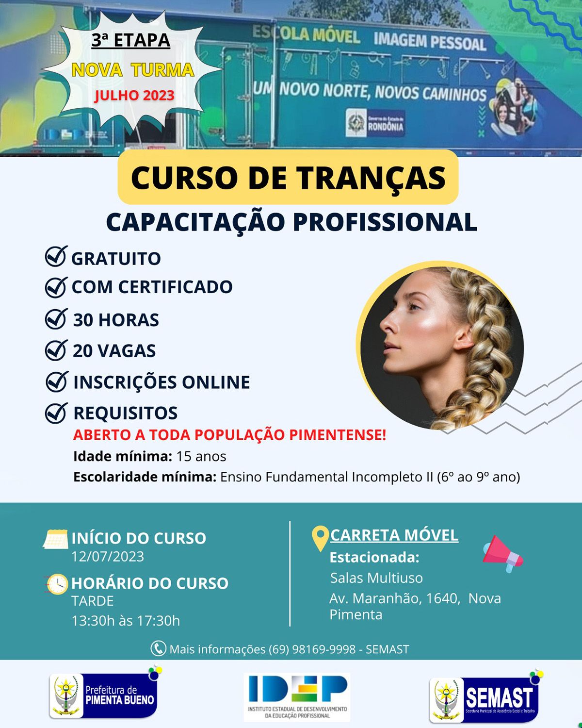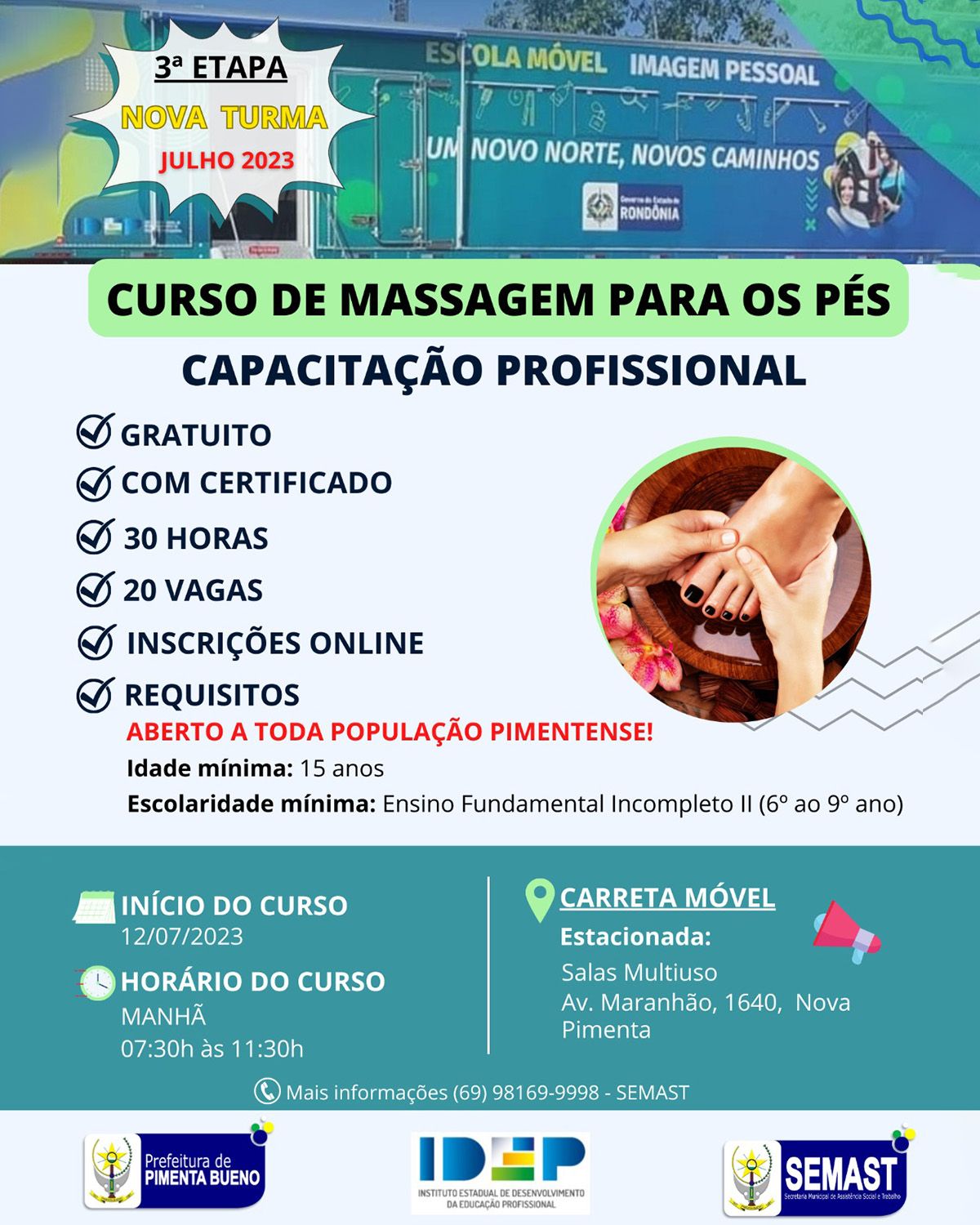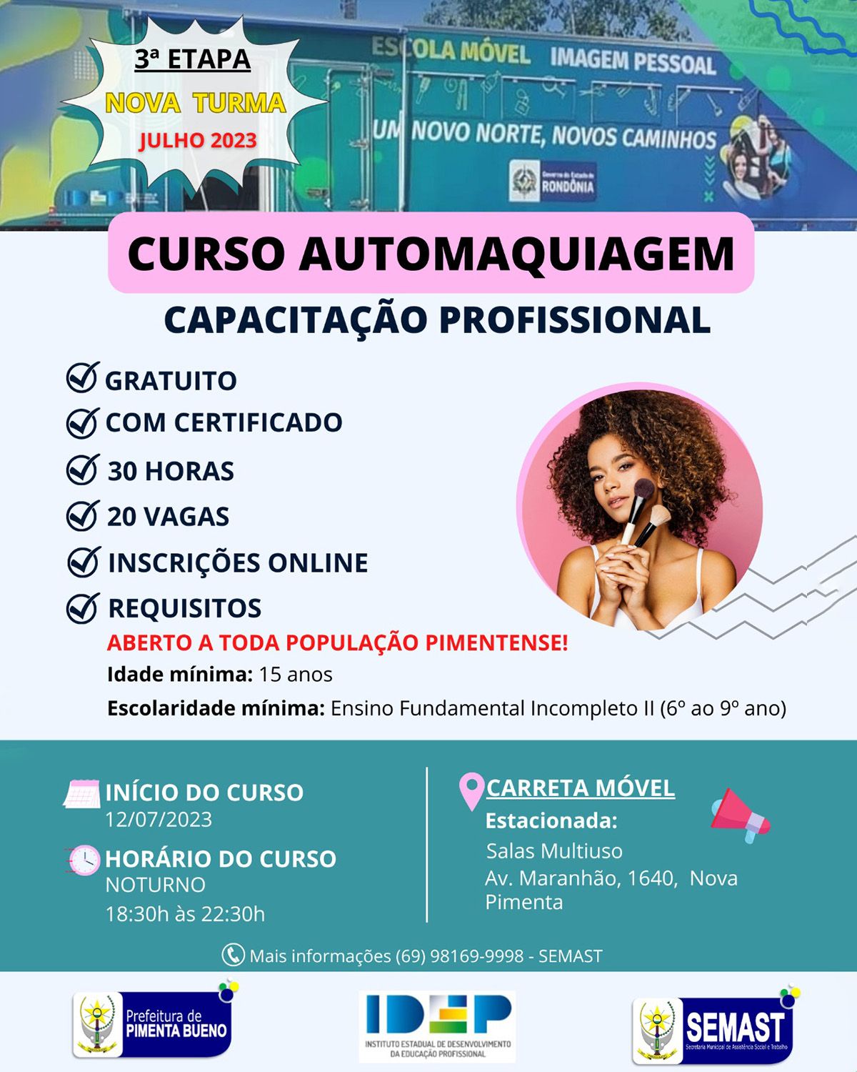 A Prefeitura Municipal de Pimenta Bueno em parceria com o IDEP/ Governo do Estado de Rondônia, por meio da SEMAST, informa o Cronograma das NOVAS TURMAS – 3ª ETAPA, realizado neste mês de JULHO de 2023, na Escola Móvel de Imagem Pessoal.