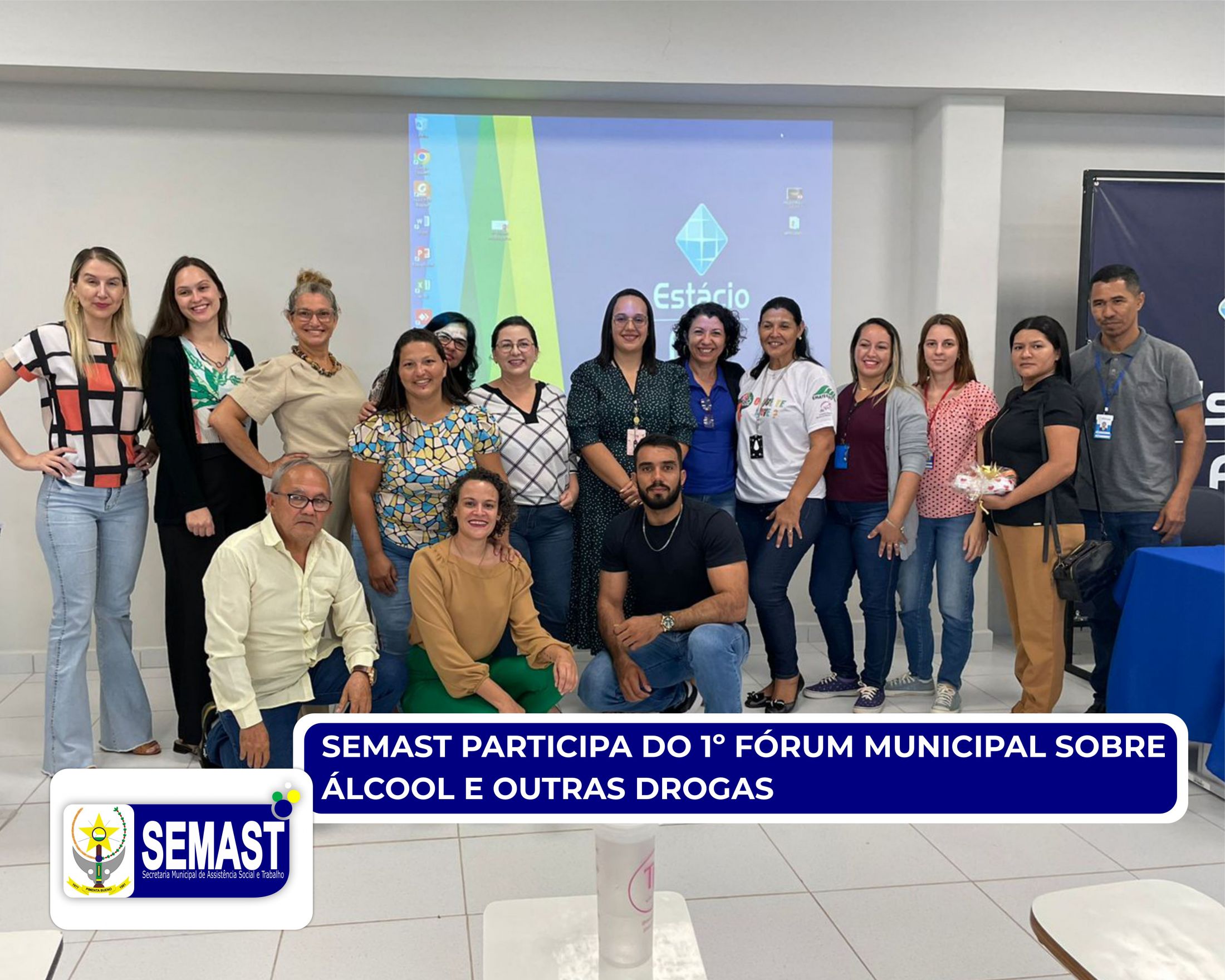 No dia 26 de junho/2023, a Secretaria Municipal de Assistência Social e Trabalho – SEMAST, participou do 1º Fórum Municipal sobre Álcool e outras Drogas, representada pelos servidores da Gestão: Cícera Silvania Leite, membro do COMPAD representante da SEMAST ; Unidade CRAS: Lucinete Cavalcante Ferreira e Paula Elisa Brandelero e CREAS, Karin Cristina Andrade de Assis Scolaro, Denise Silva Martins, Fabiano Aguiar da Silva, Karoline dos Santos Nava e Maria Jandira Zanoli, evento promovido pela Secretaria Municipal de Saúde, em parceria com o Conselho Municipal de Políticas Públicas sobre Álcool e outras Drogas – COMPAD, no Auditório da Faculdade Estácio/FAP, tendo como tema Prevenção, um dever de todos: a importância da família, estado e sociedade.