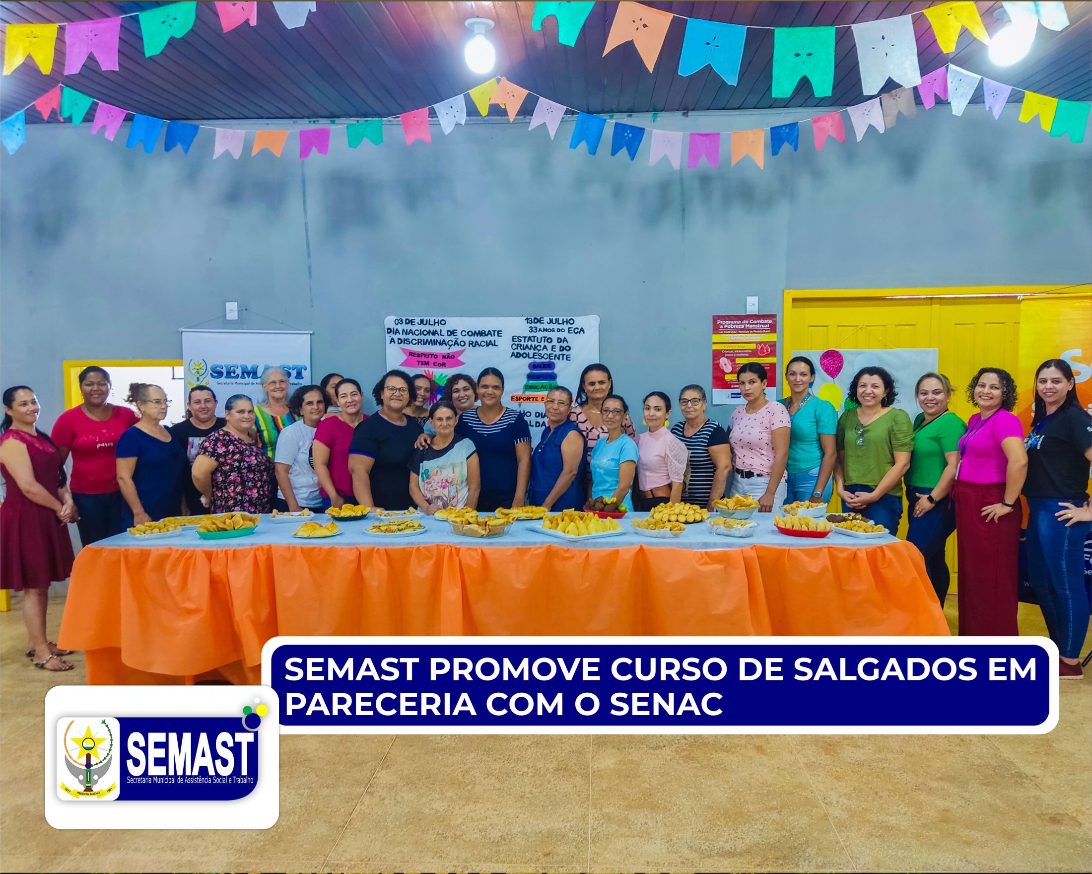A Secretaria Municipal de Assistência Social e Trabalho - SEMAST, em parceria com o Serviço Nacional de Aprendizagem Comercial - SENAC, promoveu curso de salgados visando oferecer capacitação profissional e fomentar o empreendedorismo na cidade.