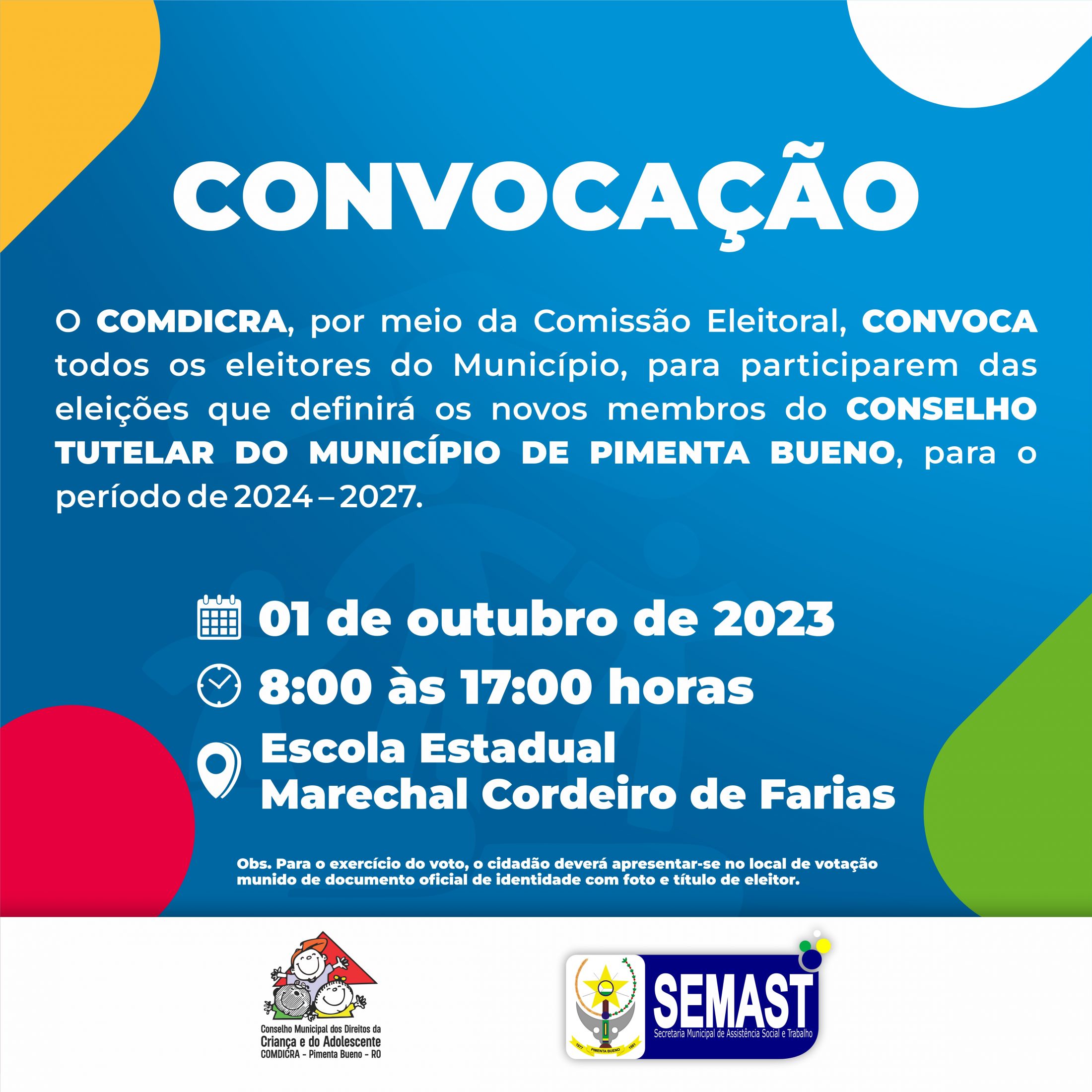 O Conselho Municipal dos Direitos da Criança e do Adolescente - COMDICRA, por meio da Comissão Eleitoral, CONVOCA todos os eleitores do Município, para participarem do processo de escolha que definirá os novos membros do CONSELHO TUTELAR DO MUNICÍPIO DE PIMENTA BUENO, para o período de 2024 – 2027.