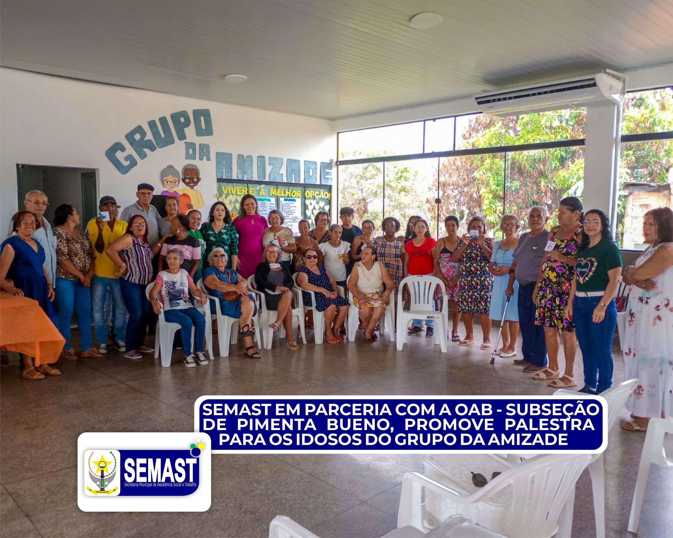 A Secretaria Municipal de Assistência Social e Trabalho - SEMAST, em parceria com a Ordem dos Advogados do Brasil - Subseção de Pimenta Bueno, em comemoração aos 20 anos do Estatuto do Idoso (Lei 10.741/2003), promoveu, neste dia 03 de outubro/2023, uma palestra para os idosos participantes do Serviço de Convivência e Fortalecimento de Vínculos do Centro da 3ª Idade, ministradas pelas Advogadas Dra. Ana Paula Sanches e Dra. Fernanda Mubarac, com foco nos direitos das pessoas idosas.