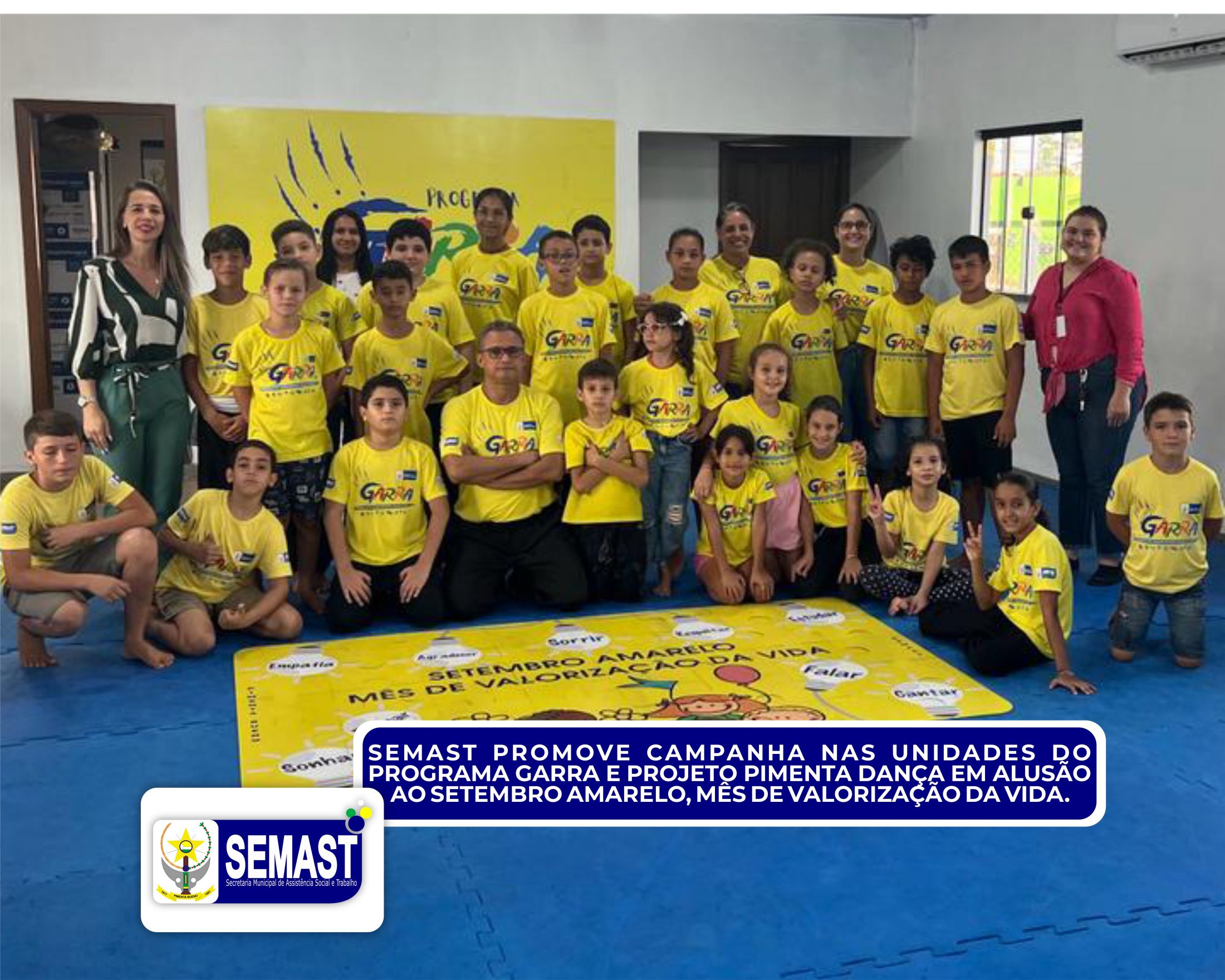 Setembro é o mês dedicado à conscientização sobre a importância da saúde mental e à prevenção ao suicídio, conhecido como Setembro Amarelo. Nesse contexto, a Secretaria Municipal de Assistência Social e Trabalho - SEMAST promoveu uma campanha especial nas Unidades do Programa Garra: Gerando Atitude, Responsabilidade, Respeito e Amor e no Projeto Pimenta Dança.