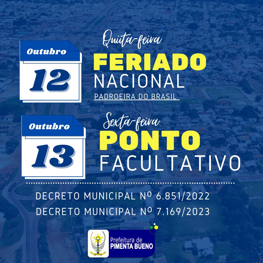 Não Haverá expediente nos órgãos da Administração Pública Direta e Indireta do Poder Executivo do Município de Pimenta Bueno/RO, em razão de feriado nos seguintes dias: