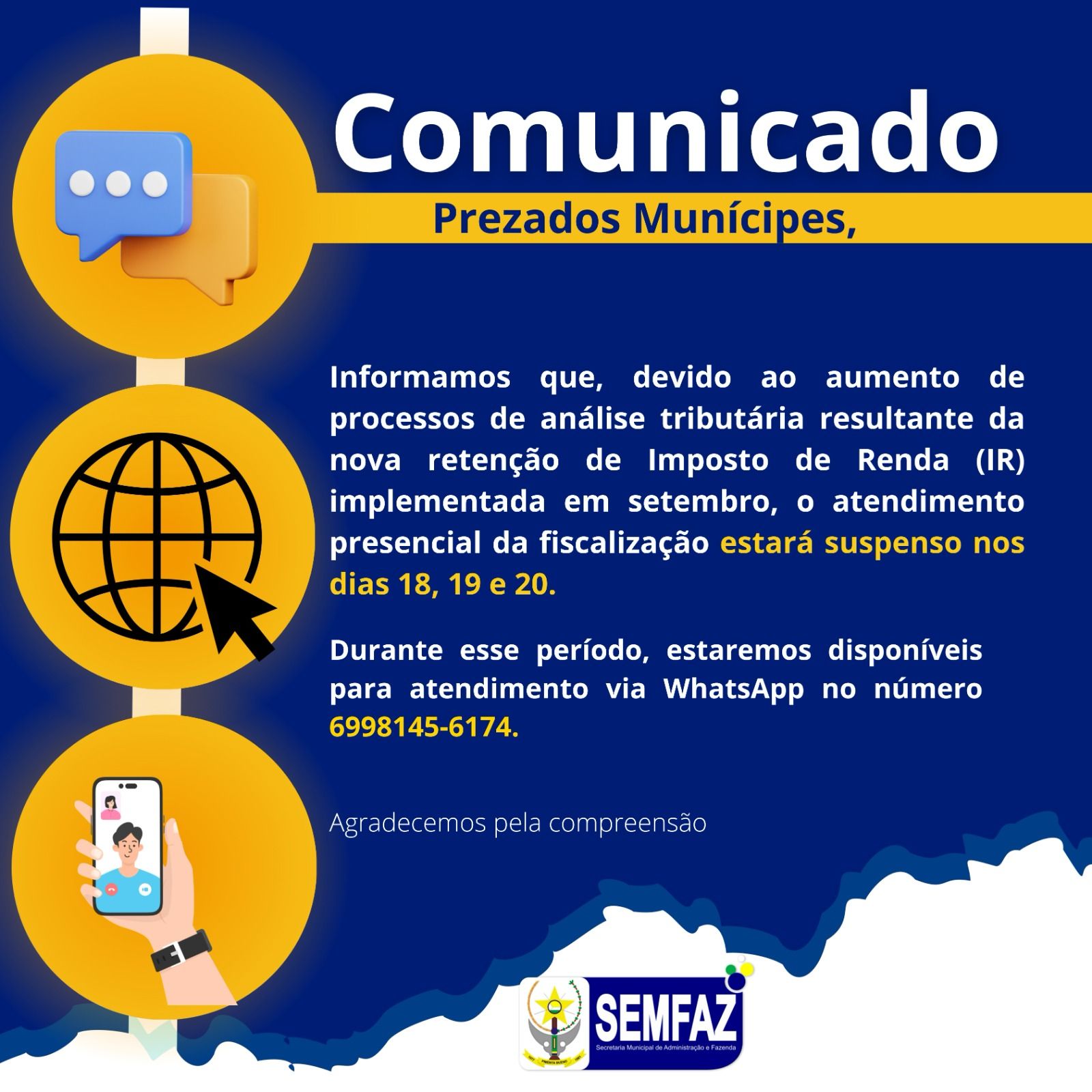 Durante esse período, estaremos disponíveis para atendimento via WhatsApp no número 6998145-6174.