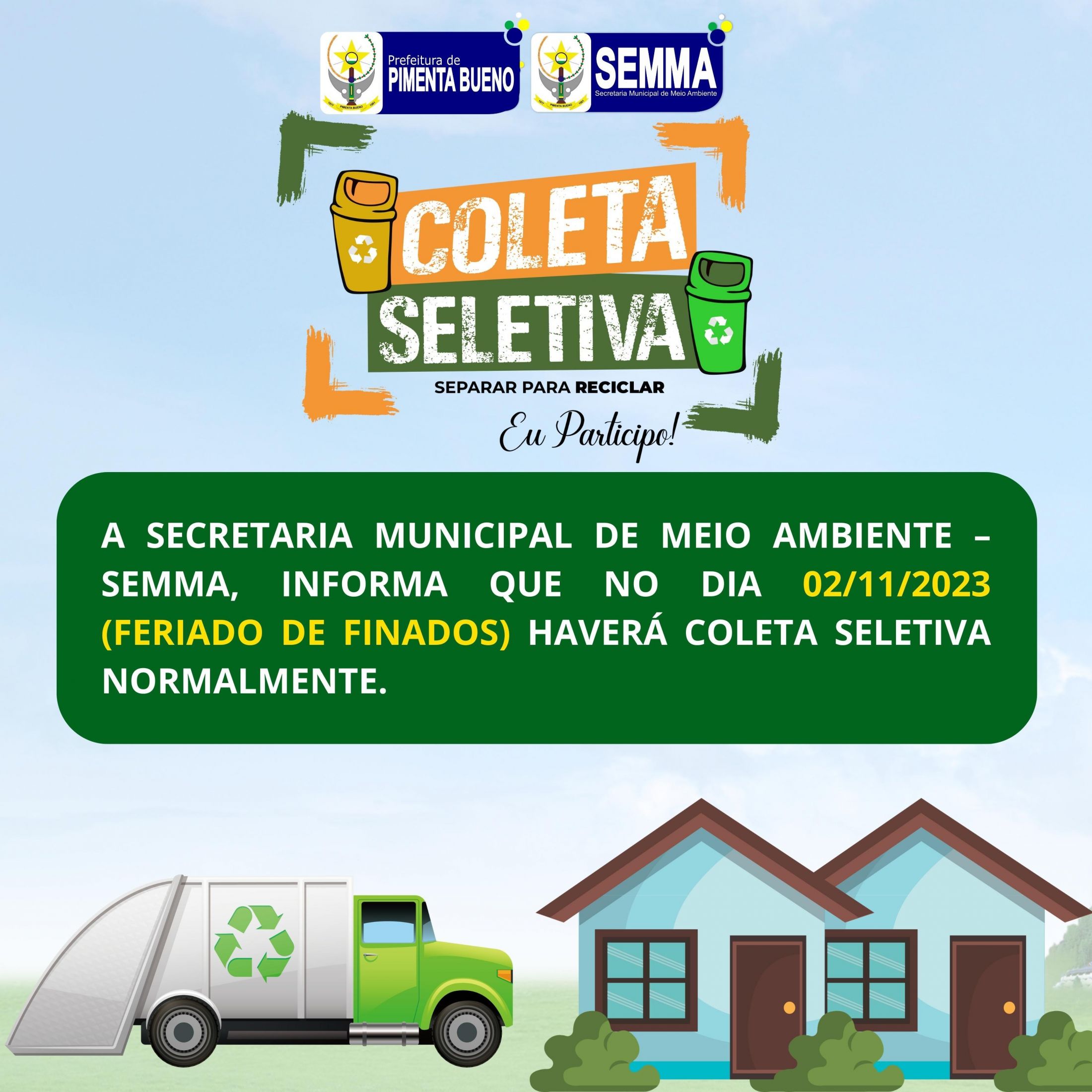 A Secretaria Municipal de Meio Ambiente – SEMMA informa que no dia 02/11/2023 (Feriado de Finados) a Coleta Seletiva acontecerá normalmente.
