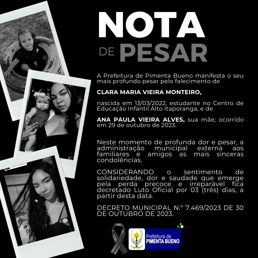 A Prefeitura de Pimenta Bueno manifesta o seu mais profundo pesar pelo falecimento de CLARA MARIA VIEIRA MONTEIRO, nascida em 13/03/2022, estudante no Centro de Educação Infantil Alto Itaporanga, e de ANA PAULA VIEIRA ALVES, sua mãe; ocorrido em 29 de outubro de 2023.