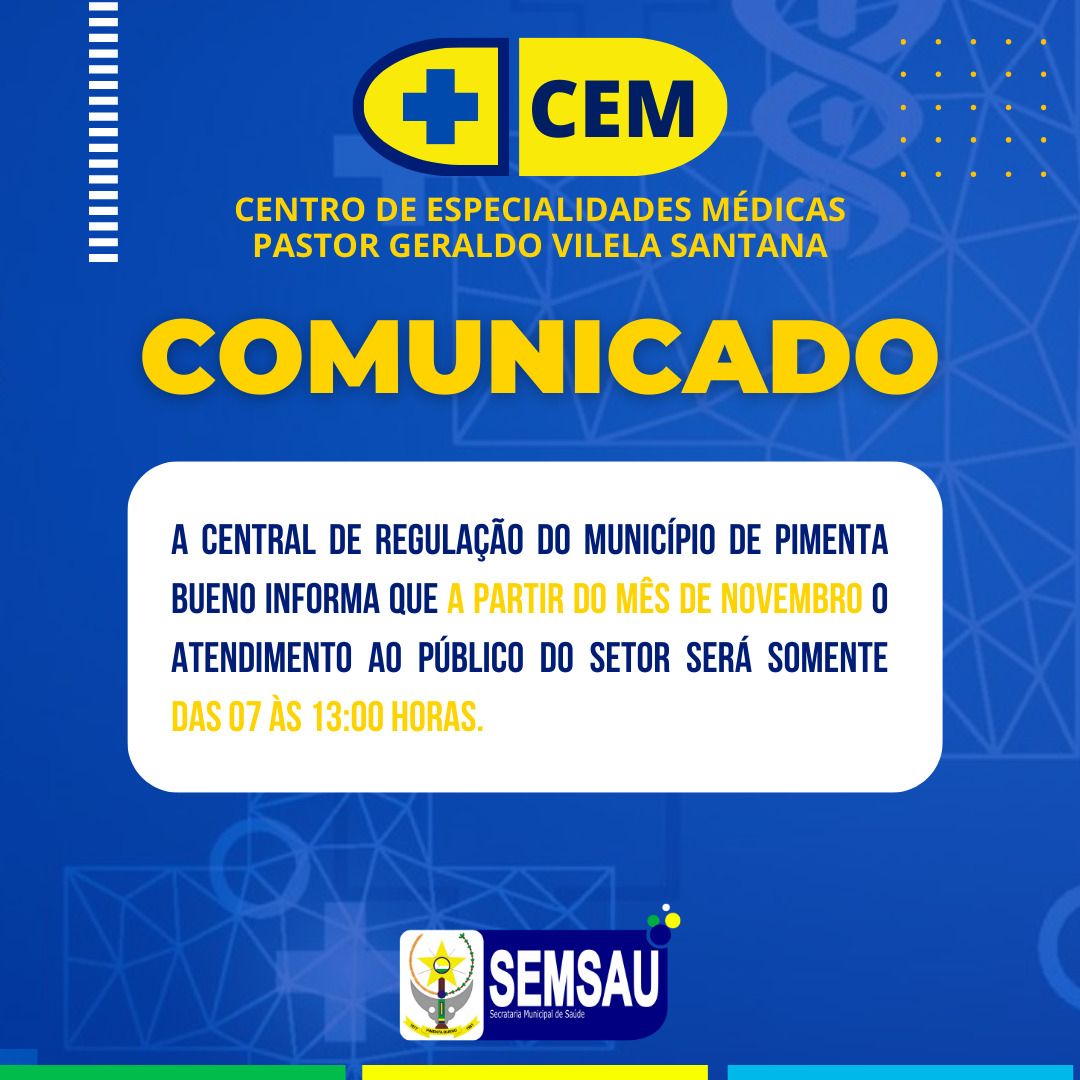 A partir do mês de Novembro, a Central de Regulação do Município de Pimenta Bueno alterará seu horário de atendimento ao público, que passará a ser das 07h às 13:00 horas neste mês. Essa mudança visa otimizar o serviço e garantir um melhor suporte aos cidadãos durante o período. A Central de Regulação permanece comprometida em atender às necessidades da comunidade de forma eficiente e eficaz