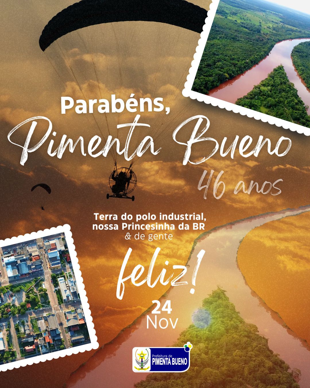 Parabéns, Pimenta Bueno, pelos 46 anos de realizações! Que o espírito de cooperação e progresso continue a guiar nossos passos, inspirando novas gerações a contribuir para o futuro brilhante que nos aguarda. Feliz aniversário!