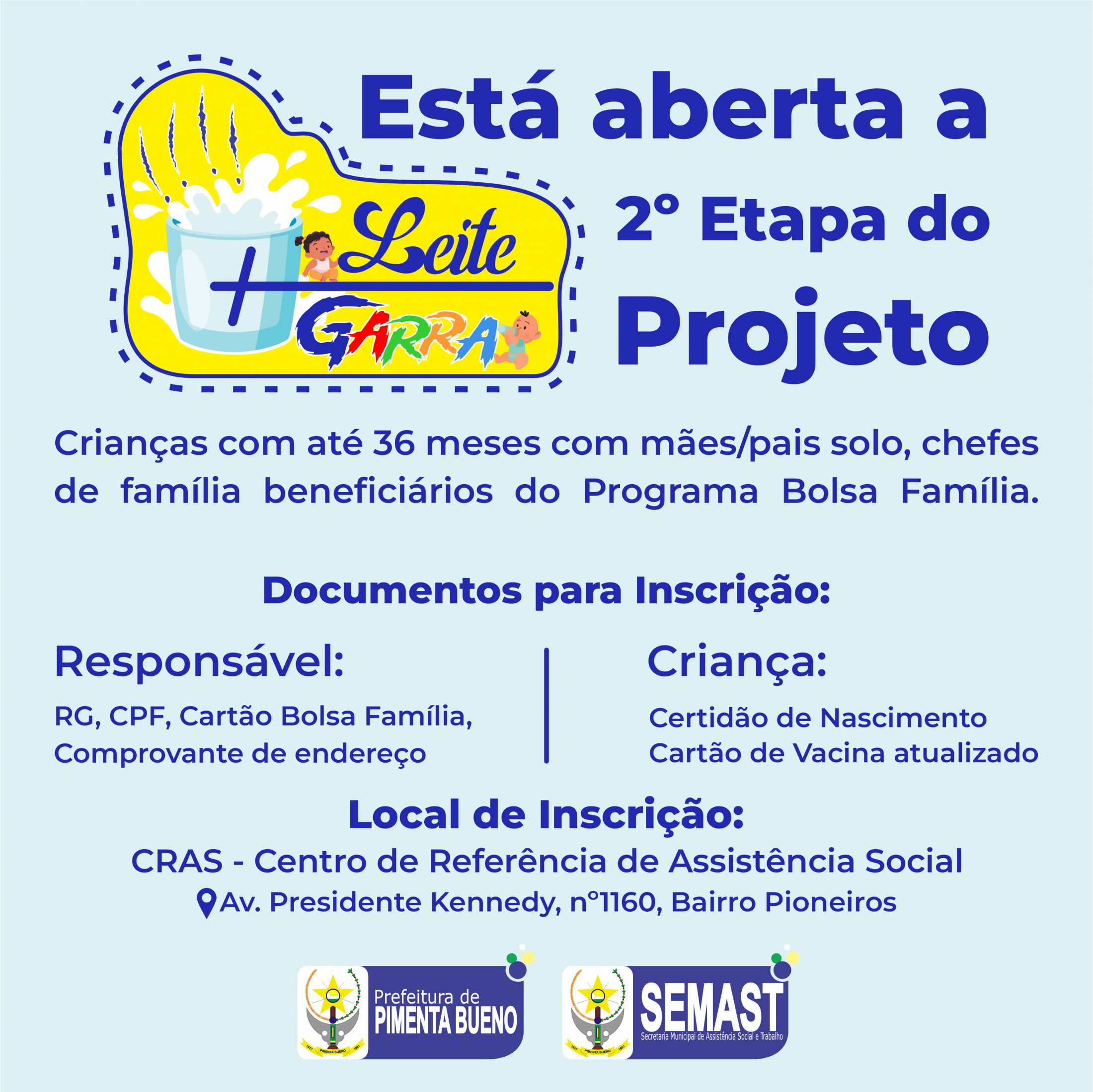 A SEMAST informa que está aberta a 2° Etapa do Projeto Leite + Garra (Garantindo o Reforço Alimentar) para a entrega de leite pasteurizado, agora abrangendo crianças com até 36 meses, cujas mães/pais solos, chefes de família beneficiários do Programa Bolsa Família.