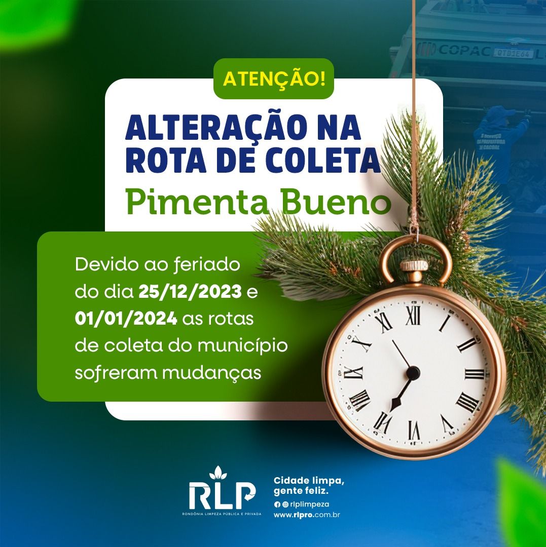 Devido ao feriado do dia 25/12/2023 e 01/01/2024, as rotas de coleta de lixo do município sofreram mudanças.