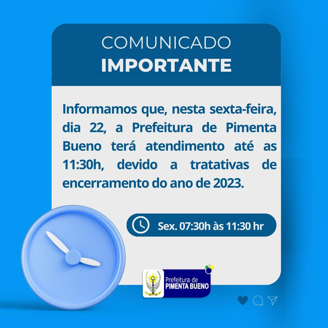 Informamos que, nesta sexta-feira, dia 22, a Prefeitura de Pimenta Bueno terá atendimento reduzido, até as 11:30horas, devido a tratativas de encerramento do ano de 2023. Sexta feira, dia 22, das 07:30h às 11:30horas.