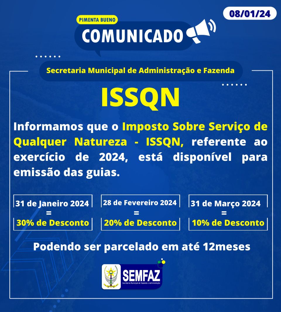ISSQN 2024 com até 30% de desconto. Já está disponível para emissão das guias. Confira: