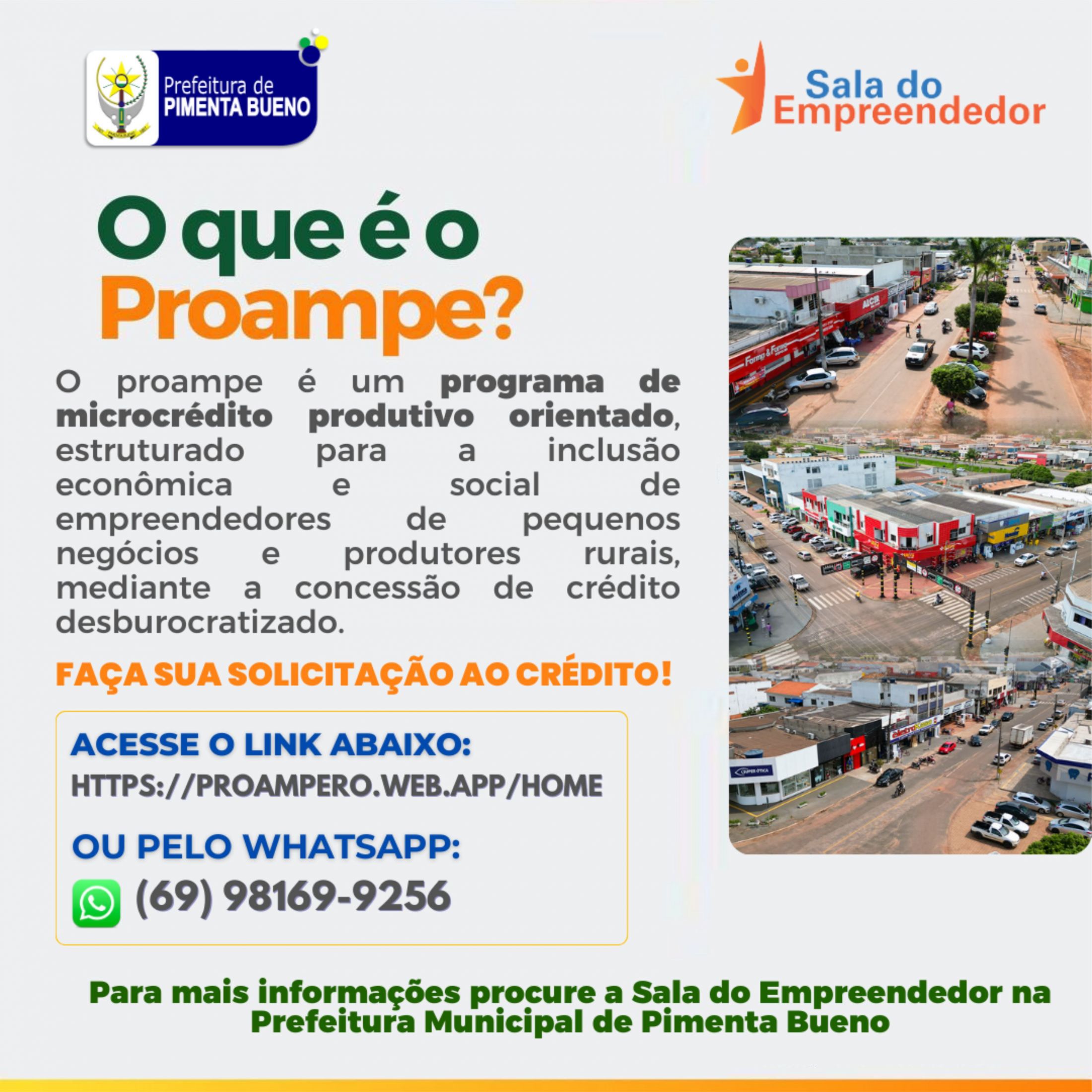 Para ter acesso a mais informações ou solicitar o apoio do PROAMPE, basta entrar em contato por meio do telefone (69) 98169-9256 ou presencialmente na Sala do Empreendedor localizada na Prefeitura de Pimenta Bueno.