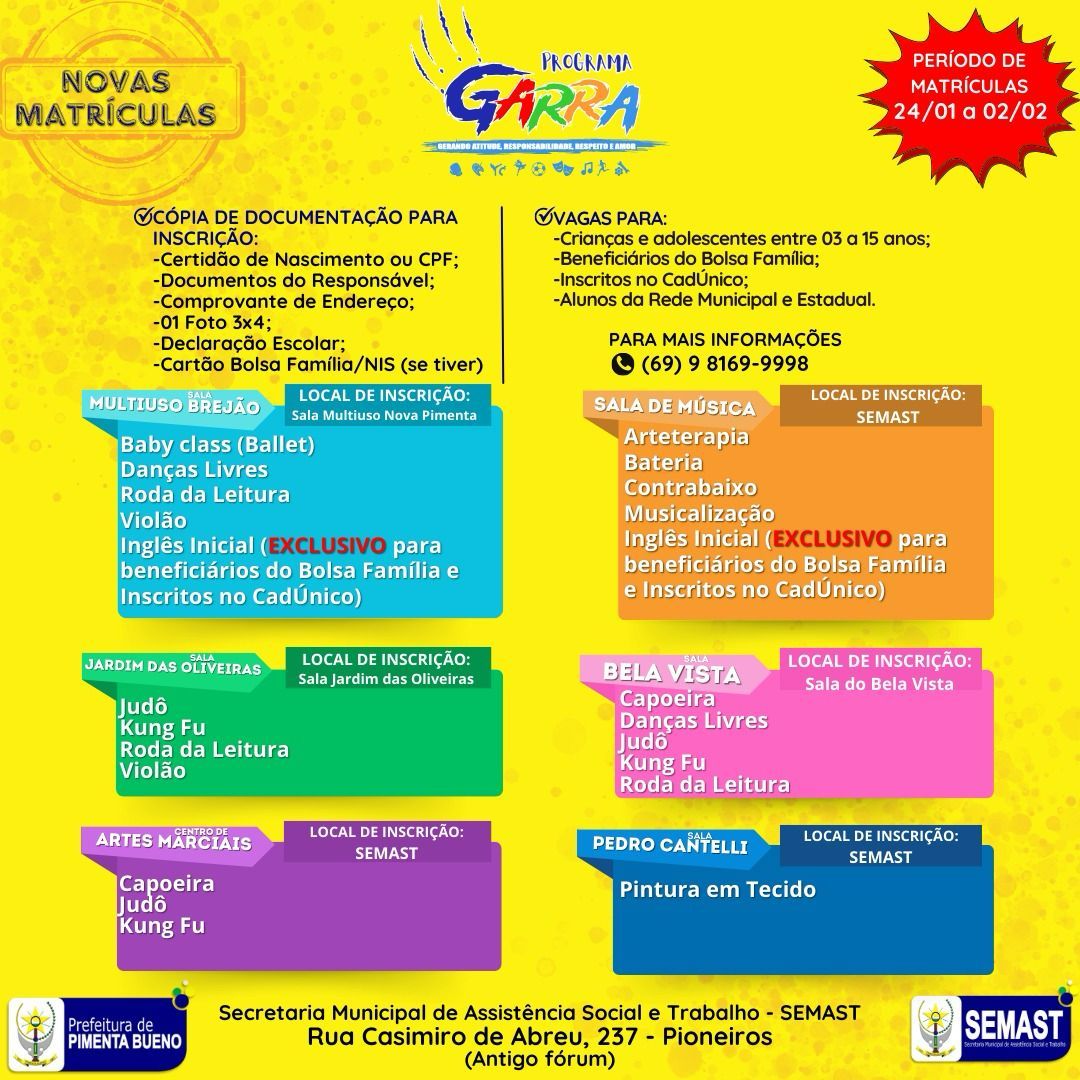 A Secretaria Municipal de Assistência Social e Trabalho - SEMAST, informa que estão abertas as matrículas para o Programa Garra para o ano de 2024.