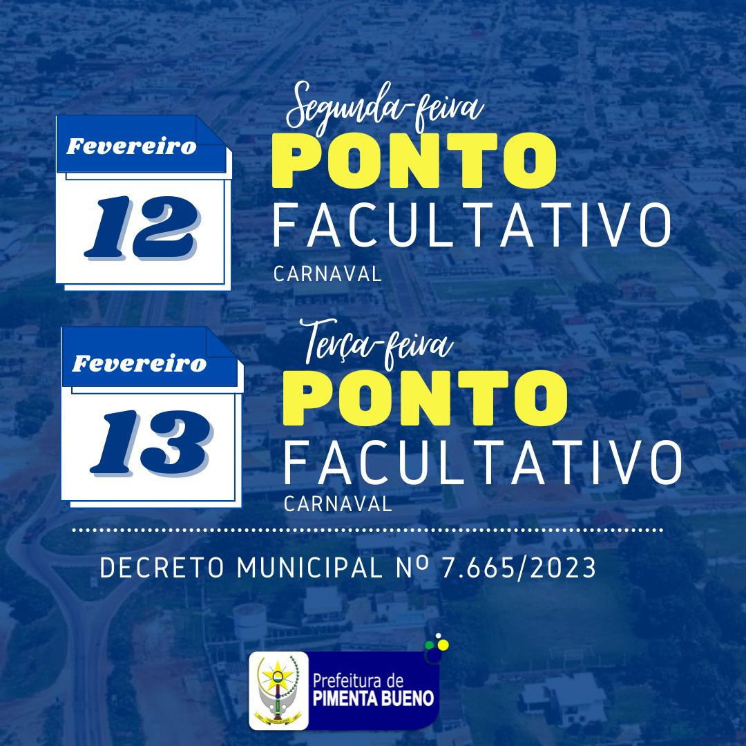 A Prefeitura de Pimenta Bueno informa que fica estabelecido ponto facultativo nos órgãos da administração direta e indireta do Município de Pimenta Bueno, nos dias 12 e 13 fevereiro de 2024.