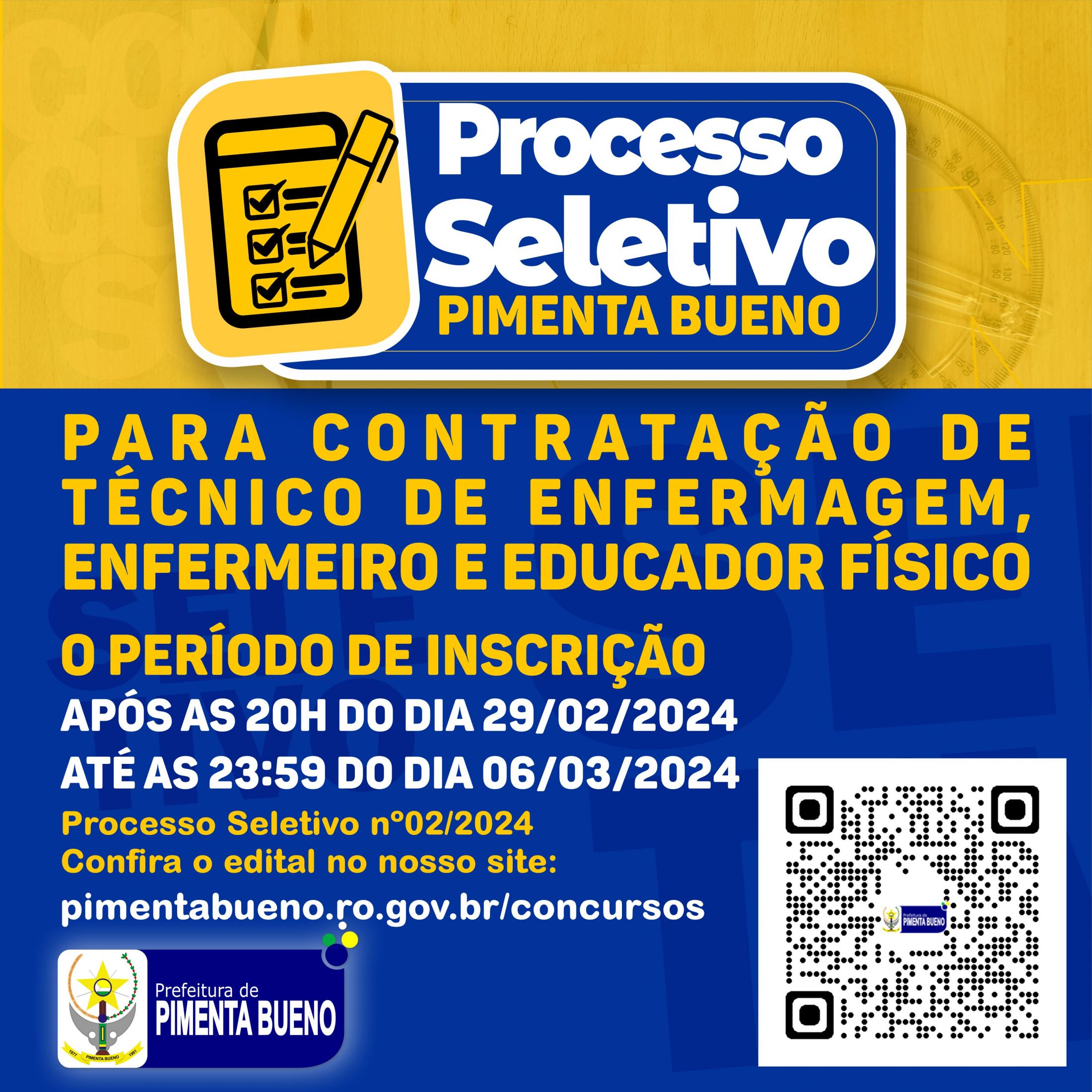 A Secretaria Municipal de Saúde do Município de Pimenta Bueno, RO, através da Comissão Organizadora nomeada pela Portaria Municipal nº 138/GP/2024, tendo em vista os resultados dos processos administrativo nº 1104/2024 e 2244/2024, torna público que realizará seleção através de Teste Seletivo para provimento de cargos do quadro de servidores da Prefeitura Municipal de Pimenta Bueno - RO.