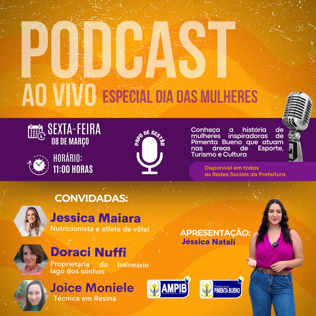 Celebre o Dia Internacional da Mulher de uma maneira especial! Junte-se a nós no Podcast Ao Vivo Especial de Dia das Mulheres, onde vamos conhecer as histórias inspiradoras de mulheres incríveis de Pimenta Bueno nas áreas de cultura, esporte e turismo!