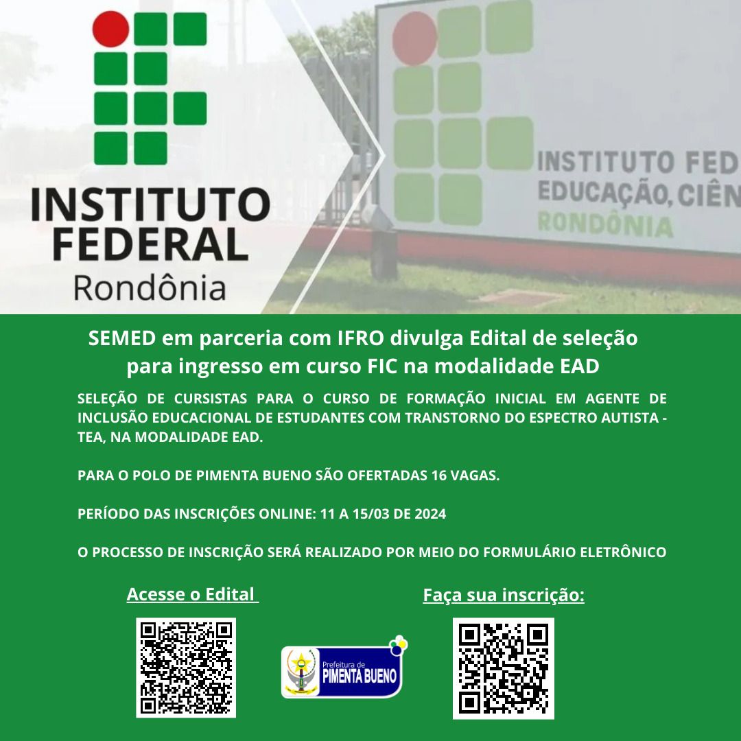 A Prefeitura Municipal de Pimenta Bueno e SEMED - Secretaria Municipal de Educação de Pimenta Bueno, em parceria com o Instituto Federal de Educação, Ciência e Tecnologia de Rondônia (IFRO), divulga EDITAL Nº 15/2024/PVCAL - CGAB/IFRO, DE 07 DE MARÇO DE 2024 de seleção de Cursistas para o Curso de Formação Inicial em Agente de Inclusão Educacional de Estudantes com Transtorno do Espectro Autista - TEA, na modalidade EaD