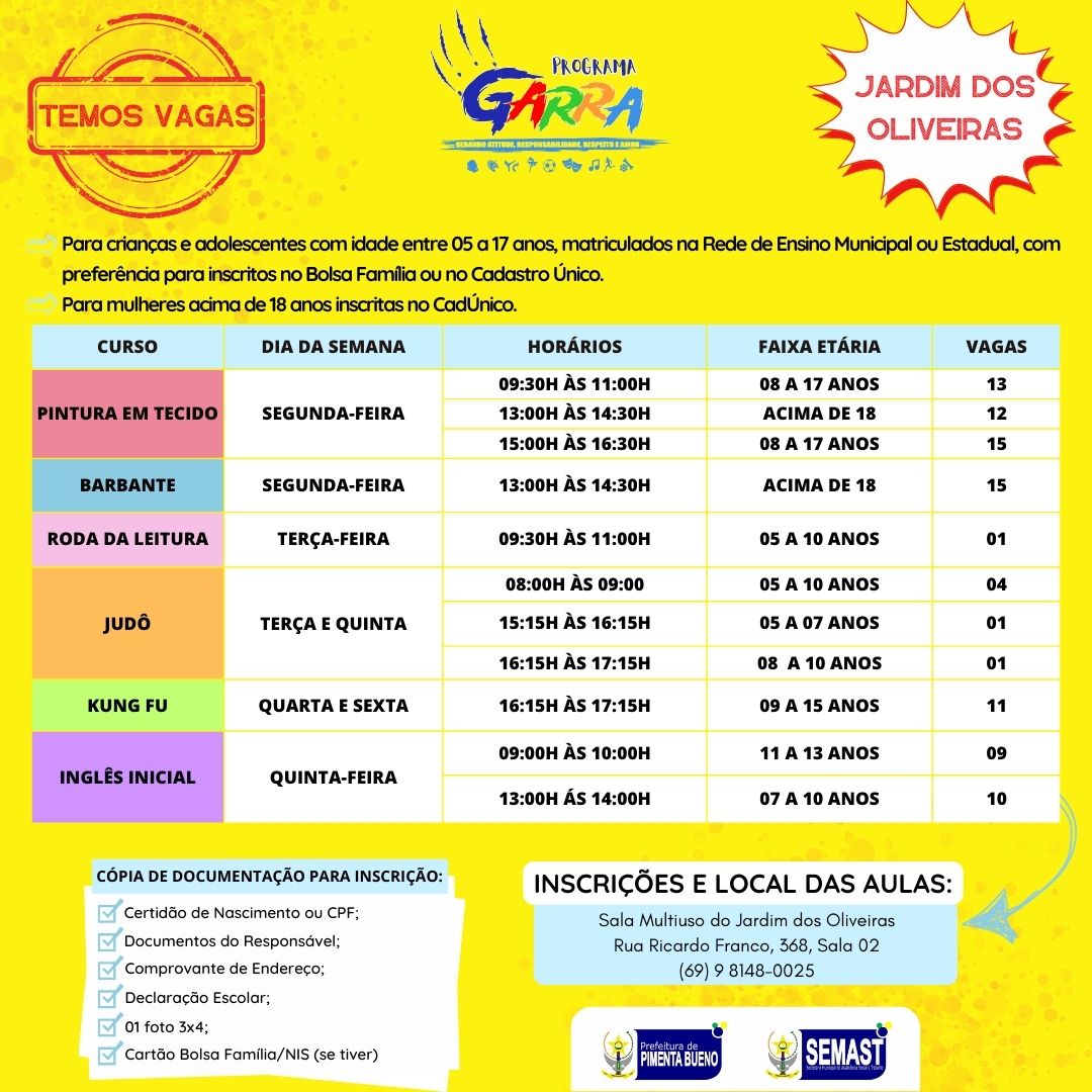 A Secretaria Municipal de Assistência Social e Trabalho - SEMAST, informa que está com vagas abertas para o Programa Garra, no bairro do Jardim dos Oliveiras.