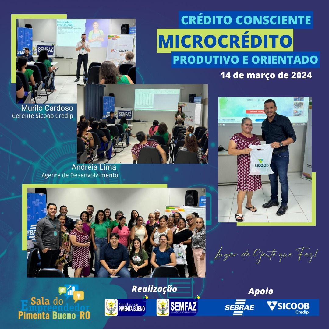 A Prefeitura de Pimenta Bueno, por meio da Secretaria Municipal de Fazenda e Administração e Sala do Empreendedor, em parceira com o SICOOB Credip e Sebrae, realizou no dia 14 de março palestra sobre Crédito consciente ministrado pelo gerente Geral do Sicoob Credip Murilo Cardoso, bem como apresentação das linhas de crédito do Proampe para as mulheres do Elas Empreendem pela Agente de Desenvolvimento Andréia Lima.