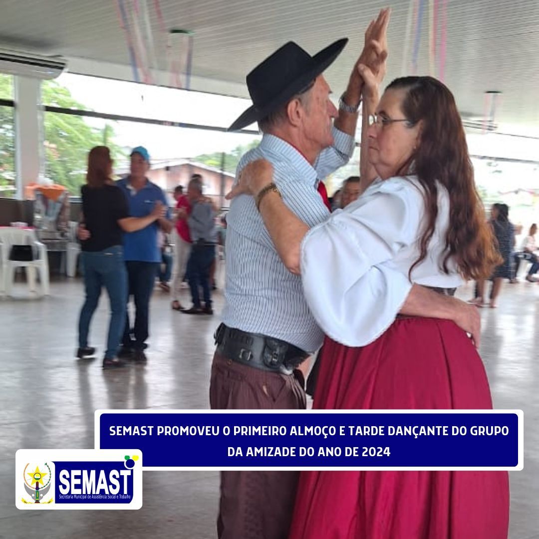 No dia 27 de fevereiro/2024, a Secretaria Municipal de Assistência Social e Trabalho - SEMAST, promoveu o primeiro e tradicional almoço e tarde dançante do Grupo da Amizade deste ano de 2024, no Centro de Convivência da Terceira Idade, o qual acontece toda última terça-feira de cada mês para os idosos do nosso Município.