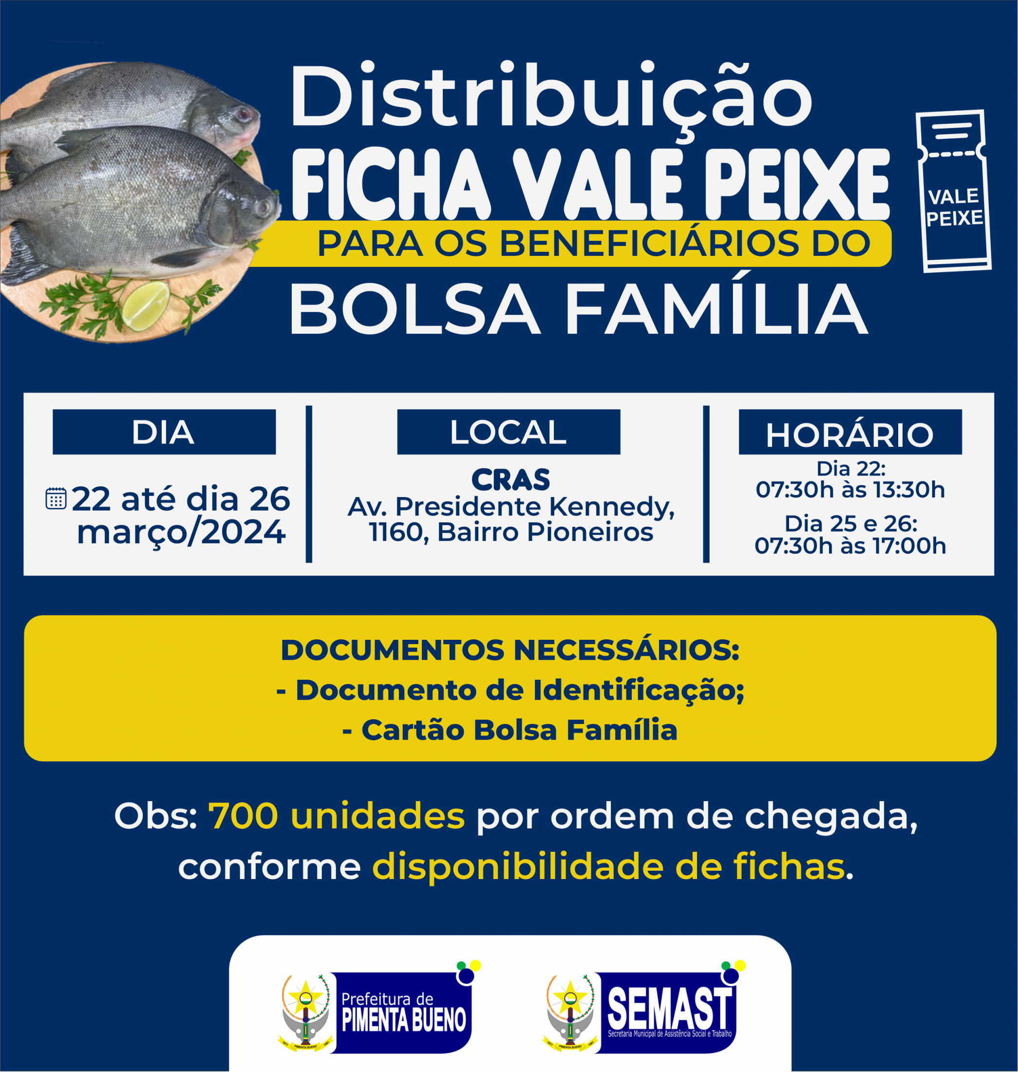 A Prefeitura Municipal de Pimenta Bueno, através da Secretaria Municipal de Assistência Social e Trabalho - SEMAST fará a entrega de Vale Peixe para as famílias beneficiárias do Programa Bolsa Família. Serão disponibilizadas 700 fichas, as quais serão entregues por ordem de chegada.