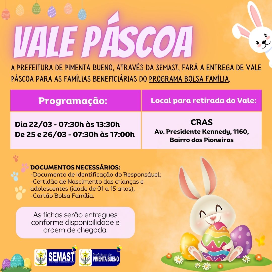 A Prefeitura Municipal de Pimenta Bueno, através da Secretaria Municipal de Assistência Social e Trabalho - SEMAST fará a entrega de Vale Páscoa para as famílias beneficiárias do Programa Bolsa Família. As fichas serão entregues conforme disponibilidade e ordem de chegada.