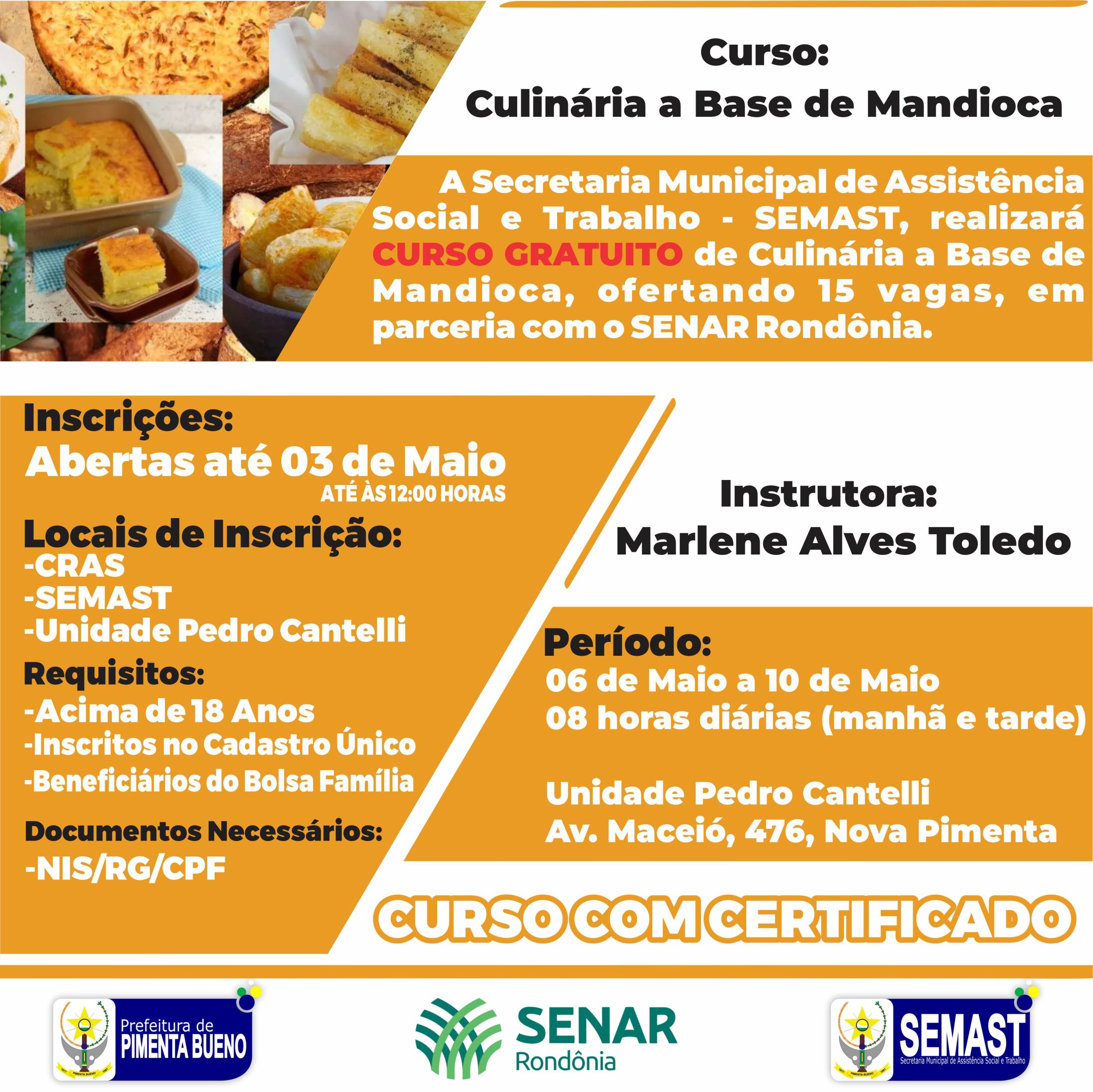 A Secretaria Municipal de Assistência Social e Trabalho - SEMAST, realizará CURSO GRATUITO de Culinária a Base de Mandioca, ofertando 15 vagas, em parceria com o SENAR Rondônia.