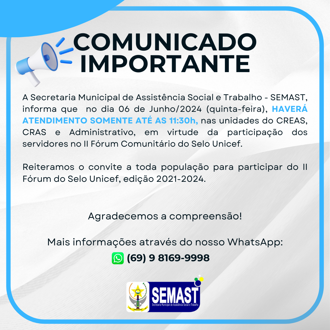 A Secretaria Municipal de Assistência Social e Trabalho - SEMAST, informa que no dia 06 de Junho/2024 (quinta-feira), HAVERÁ ATENDIMENTO SOMENTE ATÉ AS 11:30h, nas unidades do CREAS, CRAS e Administrativo, em virtude da participação dos servidores no II Fórum Comunitário do Selo Unicef.
