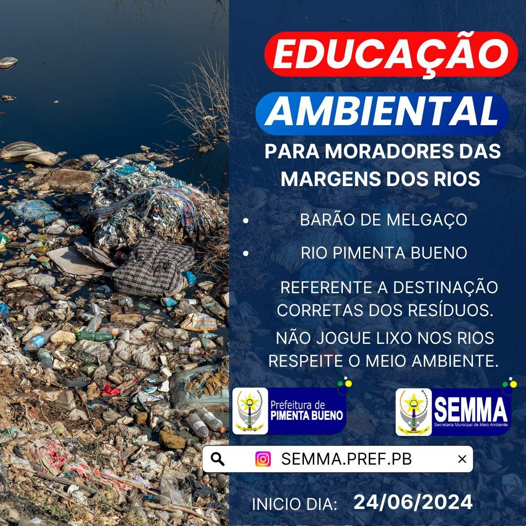 A Prefeitura de Pimenta Bueno, por meio da Secretaria Municipal De Meio Ambiente, realizará uma ação de Educação Ambiental, a partir do dia 24/06/2024, para os moradores das margens dos rios "Barrão de Melgaço e Rio Pimenta Bueno". Ressaltando a importância da destinação correta dos resíduos. A preservação dos rios é de extrema importância para a manutenção do equilíbrio ambiental e da qualidade de vida de diversas espécies, incluindo os seres humanos.