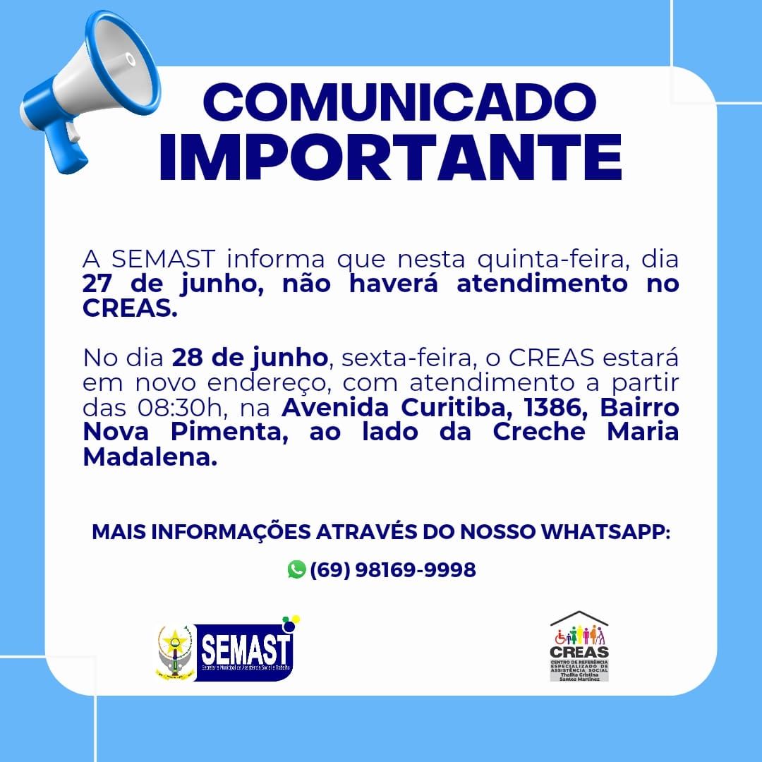 A SEMAST informa que nesta quinta-feira, dia 27 de junho, não haverá atendimento no CREAS.