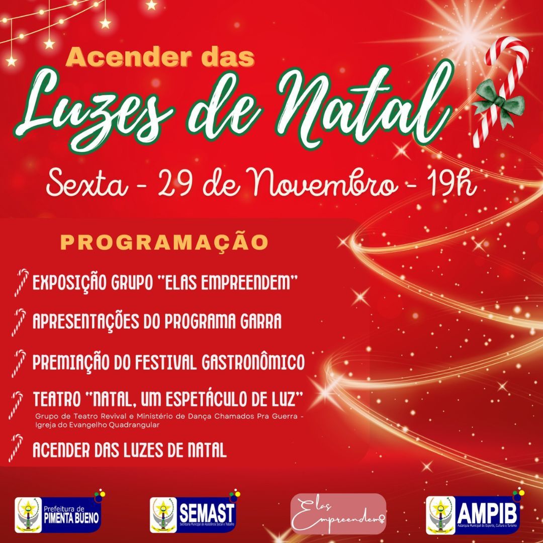 A Prefeitura de Pimenta Bueno convida você e sua família para viverem um momento especial de união, fé e celebração no Acender das Luzes de Natal, que acontecerá nesta sexta-feira, dia 29 de novembro/2024, às 19h, na Praça dos Pioneiros.